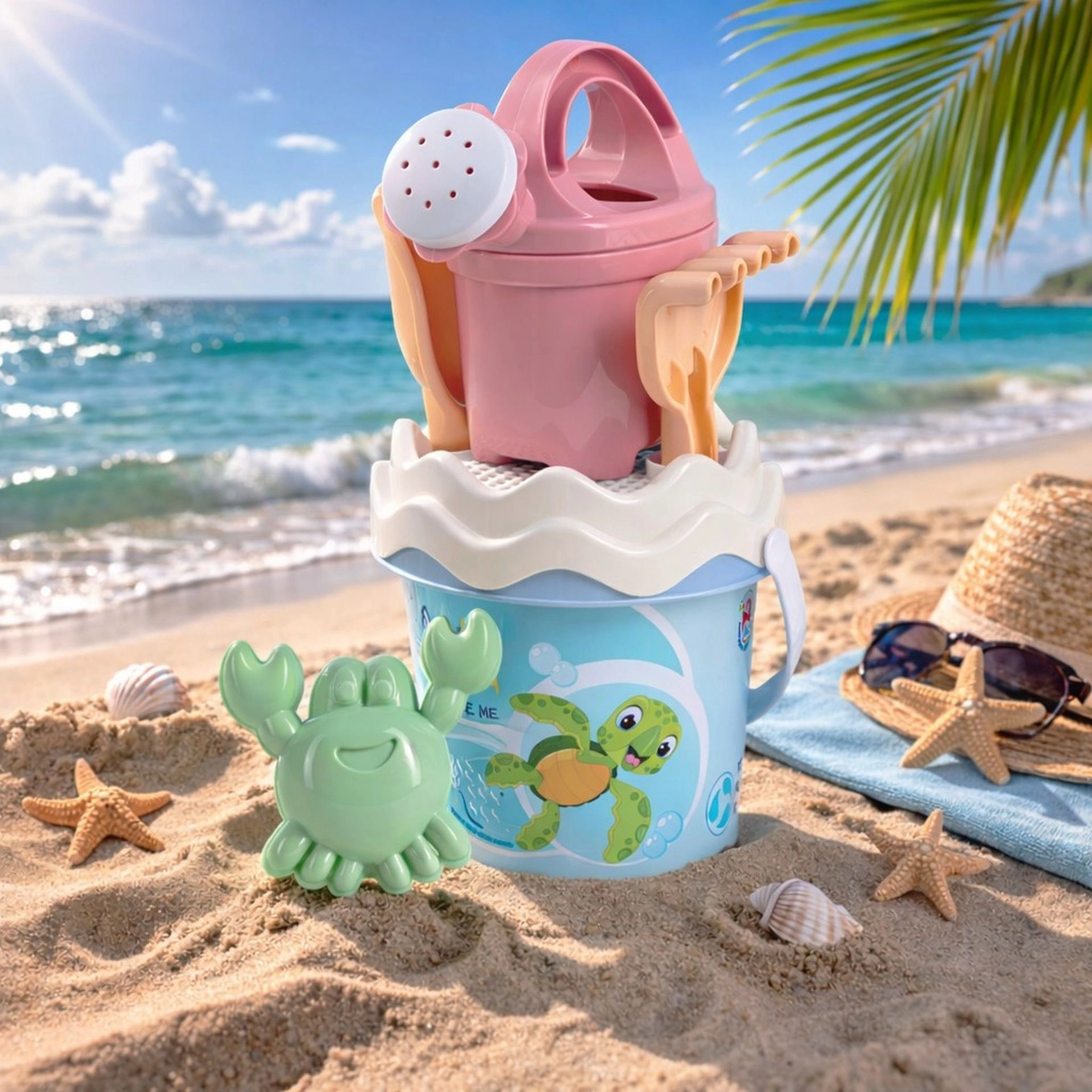 Paket sadrži sve potrebno za gradnju dvoraca i vodene igre: kantu (promjer 13 cm, visina 11 cm), kanticu za zalijevanje 0,5 l, sito, lopaticu, grabulje i kalup u obliku morskog raka. Zahvaljujući maloj težini od 0,244 kg i ukupnoj visini seta od 27,5 cm lako se nosi u park, na igralište ili na more.