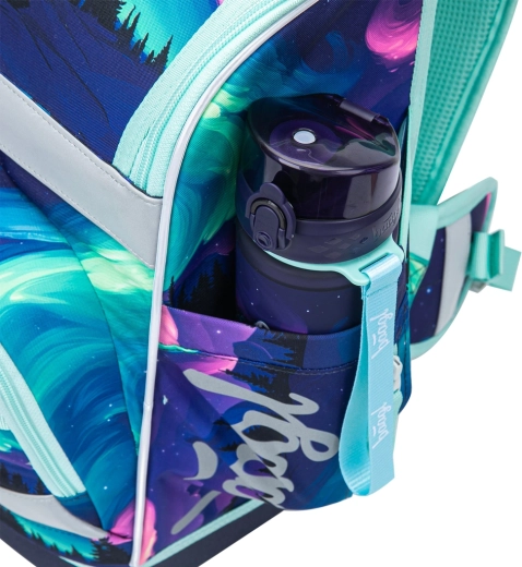 Set Zippy Plus Aurora osmišljen je da raste s djetetom i drži školsku opremu pregledno na jednom mjestu. Aktovka ima klizni leđni sustav s tri veličine, podesive naramenice, odvojivi lumbalni pojas i čvrsto dno za stabilnost. Unutrašnjost nadopunjuju organizer i termo-džep za užinu, a ne nedostaju vodoodbojni reciklirani materijali, reflektirajući elementi i pouzdani YKK zatvarači. Izgled djeca lako personaliziraju zahvaljujući izmjenjivim bedževima.