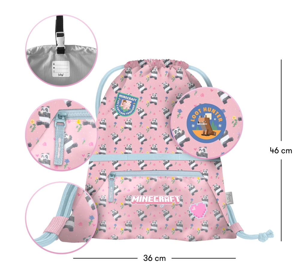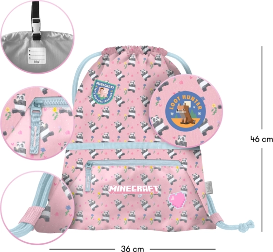 Praktična školska vrećica s motivom MINECRAFT Panda i prednjim džepom na patentni zatvarač idealna je za papuče, sport i slobodno vrijeme. Izrađena je od čvrstog perivog materijala, ima izdržljive zatezne uzice za udobno nošenje te kukicu s kopčom za jednostavno pričvršćivanje na ruksak ili aktovku.