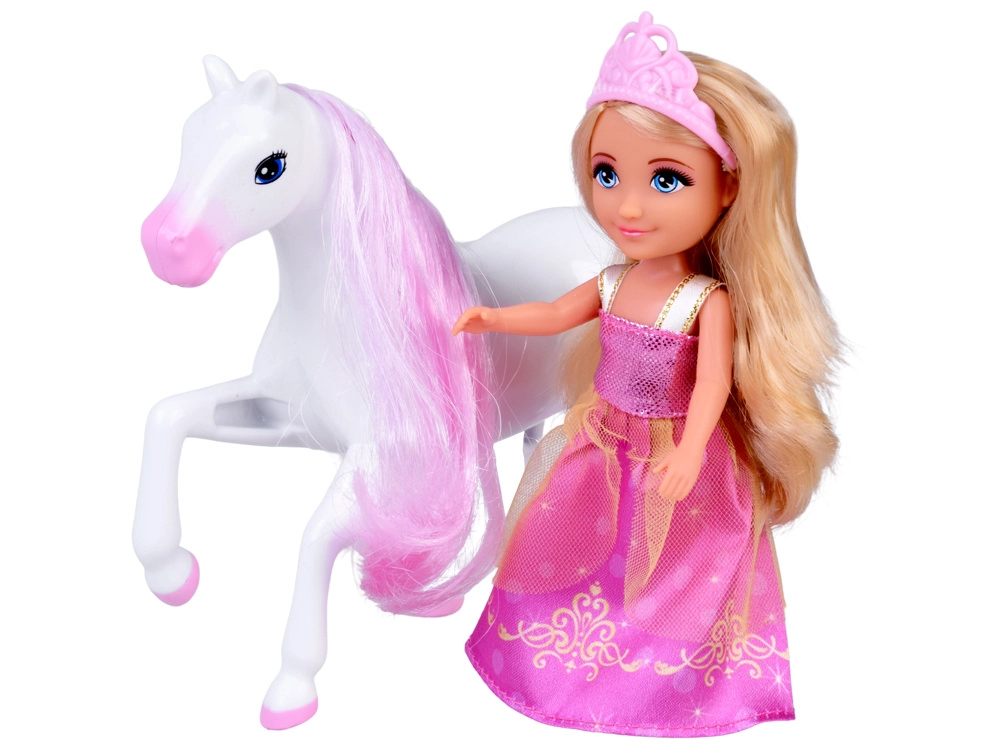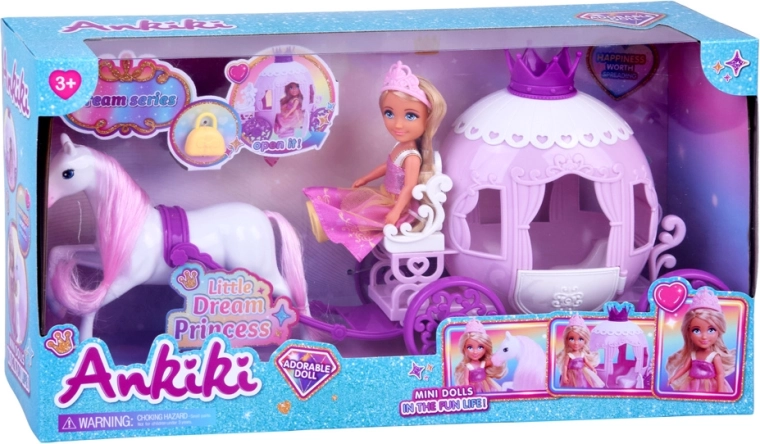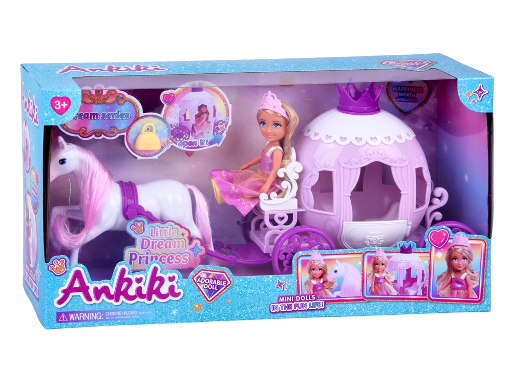 Ovaj šarmantni set donosi sve za čarobnu vožnju u kraljevstvo mašte: malu princezu u ružičastoj haljini s krunom, ukrašenu kočiju s krunom i detaljima u obliku srca te bijelog konja s ružičanom grivom i repom. Zahvaljujući kompaktnim dimenzijama, djeca ga lako nose svuda sa sobom.