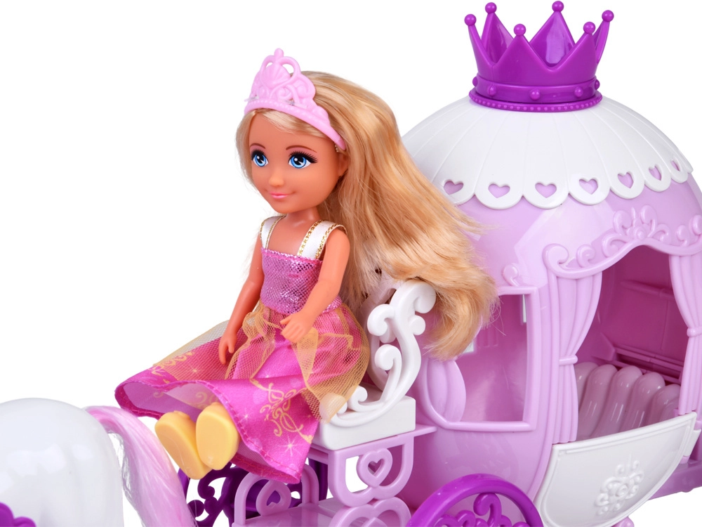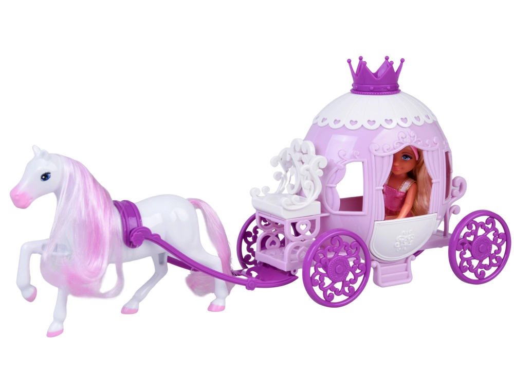 Ukrašena ružičasto-bijela kočija s krunom i dekorativnim kotačima unosi u igru istinsku bajkovitu atmosferu. Kotači se slobodno okreću, a kočija se može vući za konjem.