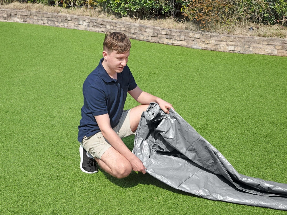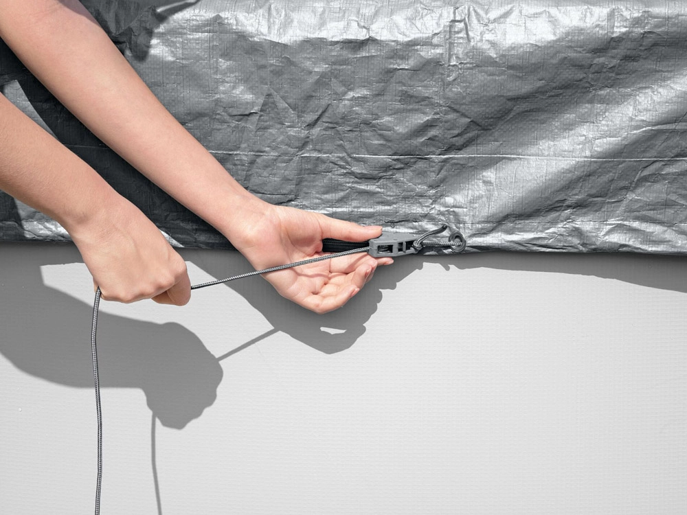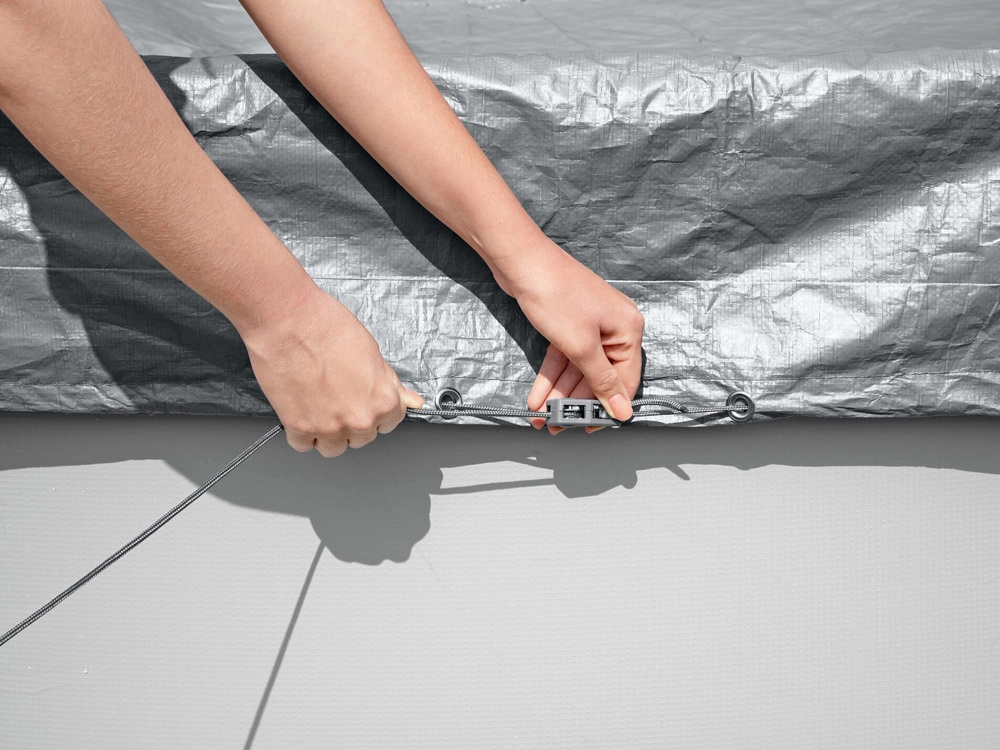 Pametni drenažni otvori propuštaju kišnicu, pa se na pokrivaču ne stvaraju lokve. Vjetrootporan stezni mehanizam i vezica osiguravaju čvrsto prijanjanje oko oboda kako bi pokrivač ostao na mjestu i pri lošijim vremenskim uvjetima.