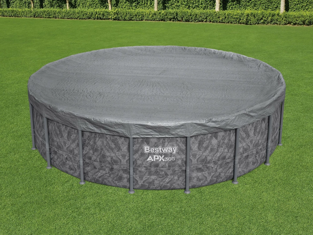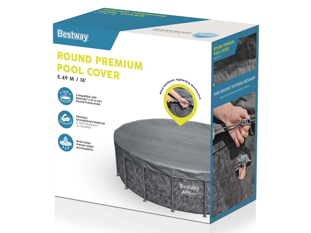 Kvalitetna pokrovna cerada BESTWAY za okrugle bazene promjera 5,49 m dizajnirana je za cjelosezonsku uporabu. Ojačani materijal s UV zaštitom otporan je na kidanje i vremenske uvjete, dok površinska obrada Polar‑Shield pomaže zadržati svojstva i pri niskim temperaturama.