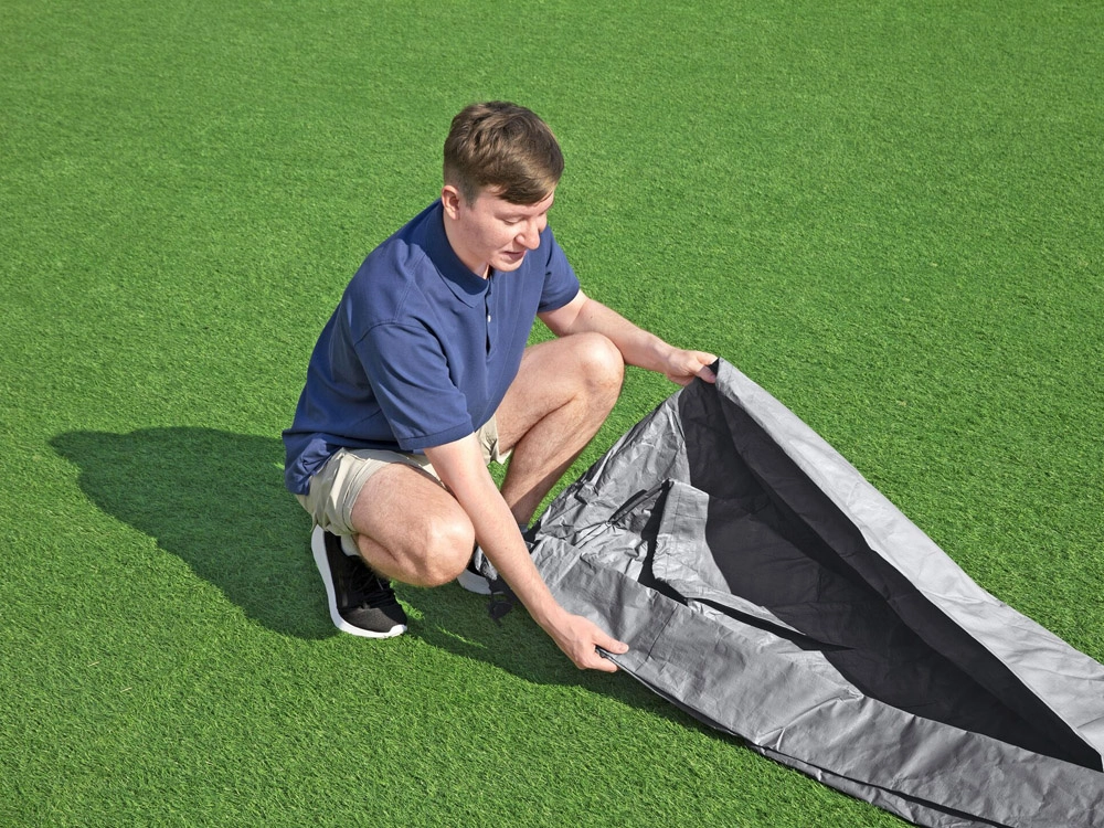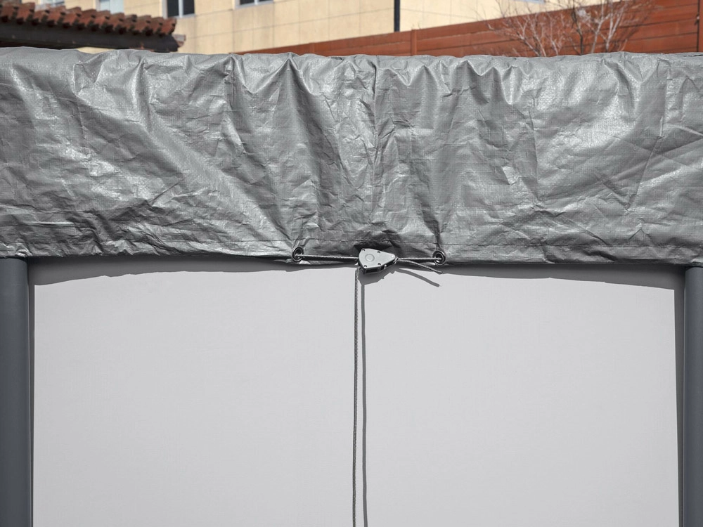 Praktične drenažne rupice odvode kišnicu, tako da se na ceradi ne stvaraju teške lokve. Vjetrootporan sustav pričvršćivanja drži ceradu čvrsto na mjestu i osigurava pouzdano prijanjanje uz rub bazena.