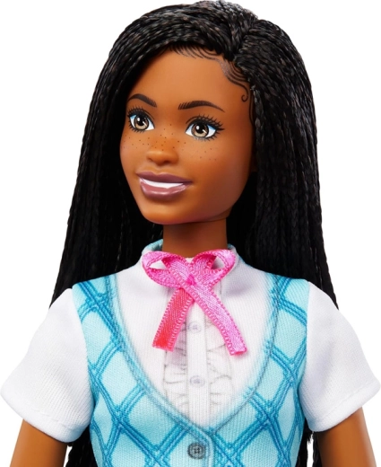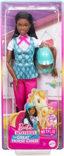 Lutka Barbie Brooklyn dolazi u modernoj jahačkoj stilizaciji: bijela košulja s argyle uzorkom, tirkizni prsluk, ružičaste jahaće hlače i visoke crne čizme. U kompletu je svijetloplava odvojiva kaciga, zahvaljujući kojoj je igra jahanja i utrka još realističnija. Detaljno izrađene pletenice i nježne crte lica naglašavaju premium izgled.