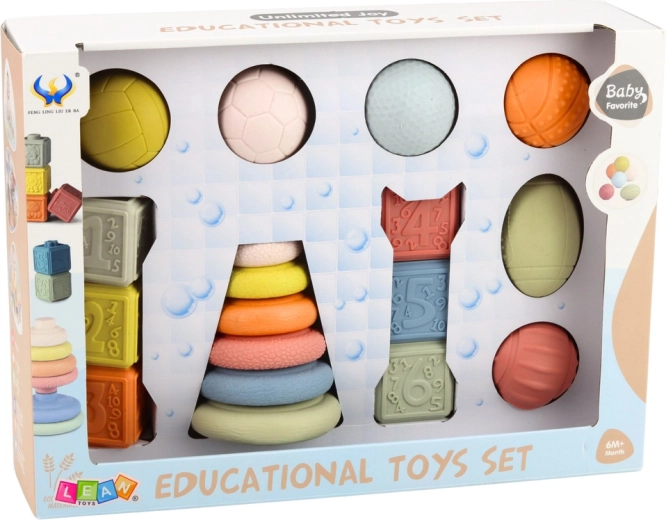 - 6 senzoričkih loptica, 6 kocki s brojkama, slagajuća piramida od 6 kolutića