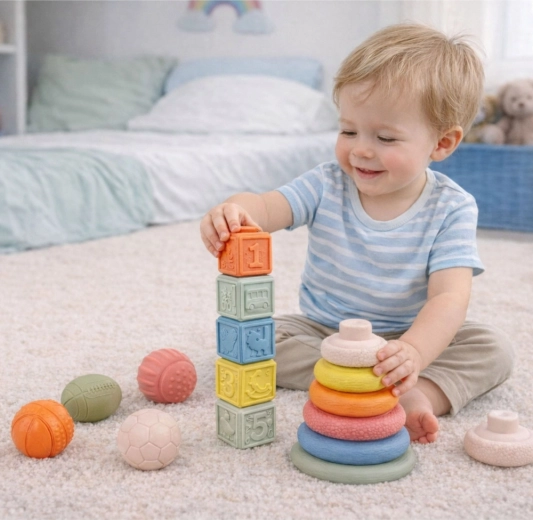 Šareni senzorički set za najmlađe razvija finu motoriku, koordinacijske vještine i taktilnu percepciju. Sadrži mekane teksturirane loptice, kocke s brojkama i slagajuće kolutiće za razvrstavanje po veličini. Sigurni, podatni materijali i žive boje potiču djecu na otkrivanje i učenje kroz igru.