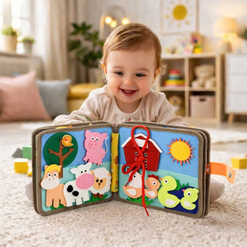 Ova mekana i lagana quiet book osmišljena je za male ručice. Na stranicama djeca pronalaze životinje s farme i iz šume, stablo, sunce, staju i druge filcane elemente koje se može otkapčati, premještati, umetati u džepiće i vezati. Zabavnom formom vježbaju vještine potrebne za predškolsku dob.
