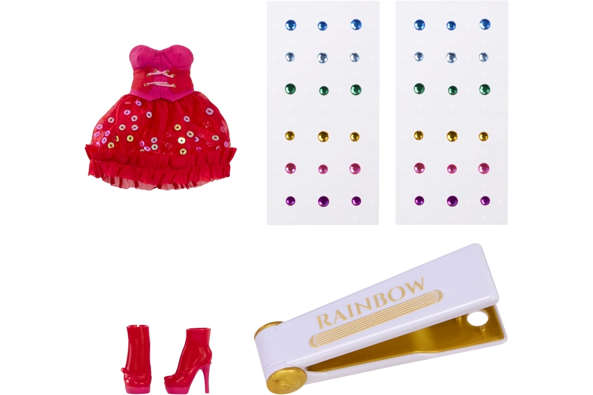 - 1 lutka s pokretnim zglobovima, 1 outfit, samoljepljivi duginim dragulji, aplikacijski alat RAINBOW