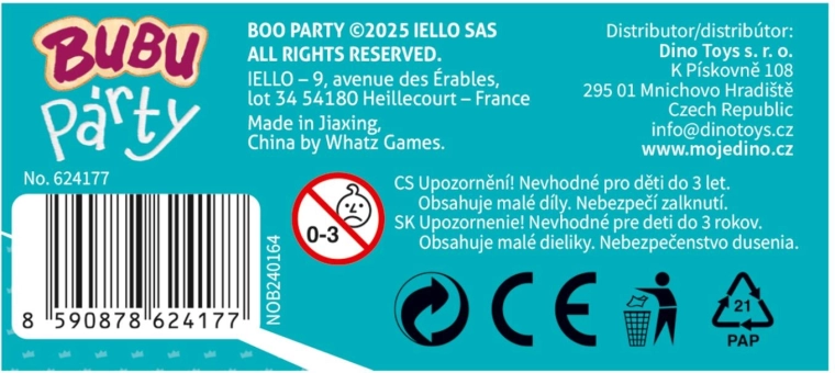 Bubu party je dinamična dječja igra prepuna šarenih kostima i simpatičnih čudovišta. Djeca u njoj na zabavan način treniraju pamćenje, koncentraciju i brzo odlučivanje. Zahvaljujući kratkim rundama i jednostavnim pravilima odlično se uklapa kao obiteljska igra za dom i za put.