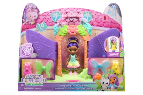 Otkrijte čarobnu preobrazbu s igraćim setom Gabinina čarobna kućica – pretvorba u vilu. Postavite Gabinu u sredinu pozornice i povucite ružičastu polugu – pred vašim očima od obične djevojčice postaje očaravajuća vila. Magnetni elementi u obliku leptira i mačkice osiguravaju brzu i intuitivnu zamjenu krila i topova, tako da se djeca mogu u potpunosti usredotočiti na igru.