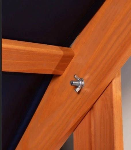 Izdržljiva platnena nadstrešnica s mogućnošću podešavanja visine i nagiba pruža sjenu tijekom igre, a nakon zatvaranja pokriva cijelu površinu pješčališta.