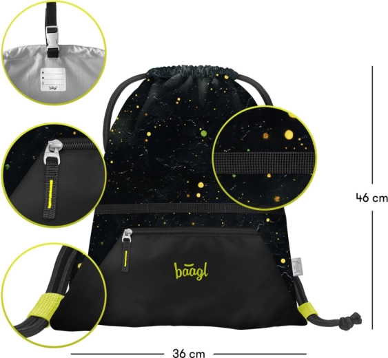 Praktična BAAGL vrećica s prednjim džepom na patent idealna je za školu i slobodno vrijeme. Nudi čvrst, periv materijal, udobno nošenje na leđima zahvaljujući uzicama te petlju s kopčom za lako pričvršćivanje na ruksak. Certifikacija GRS potvrđuje obzirnost prema prirodi.