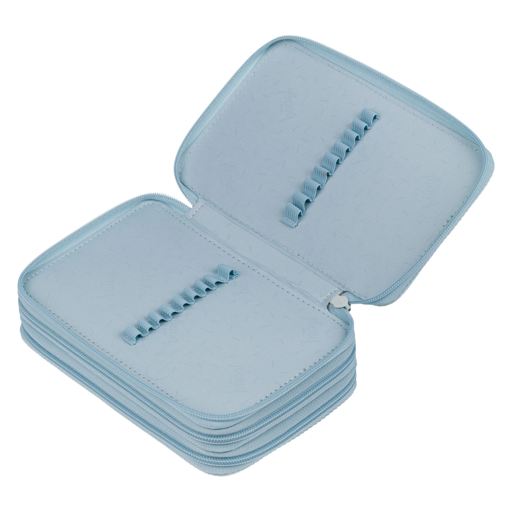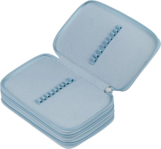 Promišljeni unutarnji raspored s fleksibilnim gumicama sigurno prima tanke i debele pisaće potrepštine – od pastele i flomastera do kemijskih olovaka, ravnala ili sitnih pomagala. Ojačani hrbat olakšava rukovanje pri zatvaranju, zatvarač oko cijelog ruba osigurava sigurno pohranjivanje sadržaja, a zaobljeni kutovi štite pernicu i njezin pribor.