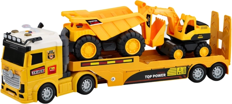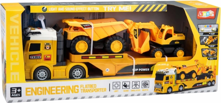 Ovaj detaljno izrađen set omogućuje malim graditeljima prevoziti strojeve na gradilište, kopati, utovarivati i istovarivati materijal. Kamion s poluprikolicom prevozi bager i kiper, pa djeca lako mogu odigravati razne scenarije od prijevoza mehanizacije do radova na gradilištu. Svjetla i zvukovi u kabini tegljača daju igri realističnu atmosferu.
