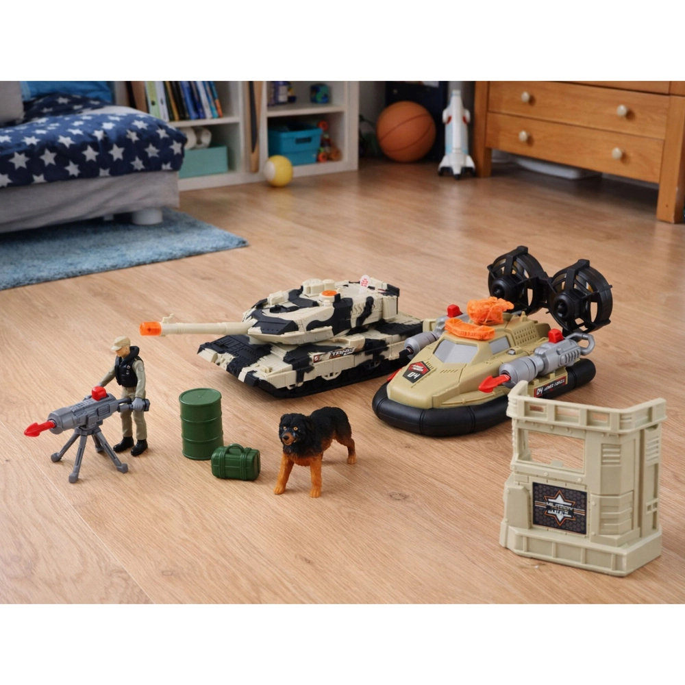 Ovaj realističan vojni set spaja omiljena vojna vozila i dodatke u jednom akcijskom paketu. Djecu će oduševiti funkcionalni efekti tenka (svjetla i zvukovi), okretna kupola za jednostavnu promjenu smjera napada te helikopter s raketometom za zračne operacije. Lebdjelica omogućuje brze premještaje “po kopnu i vodi”, idealna za specijalne zadatke.