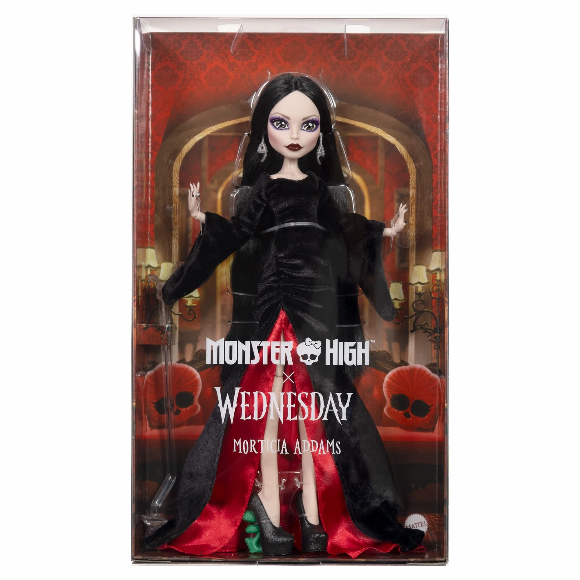 Otkrijte mračnu eleganciju slavnog lika MORTICIA ADDAMS u kolekciji Monster High Collector. Lutka oduševljava dugom crnom haljinom s dramatično širokim rukavima, baršunastom teksturom i grimiznim akcentima u prorezu. Realistična usađena (rooted) kosa, blijeda put i izražajna šminka naglašavaju autentičan izgled poznat iz serije WEDNESDAY.
