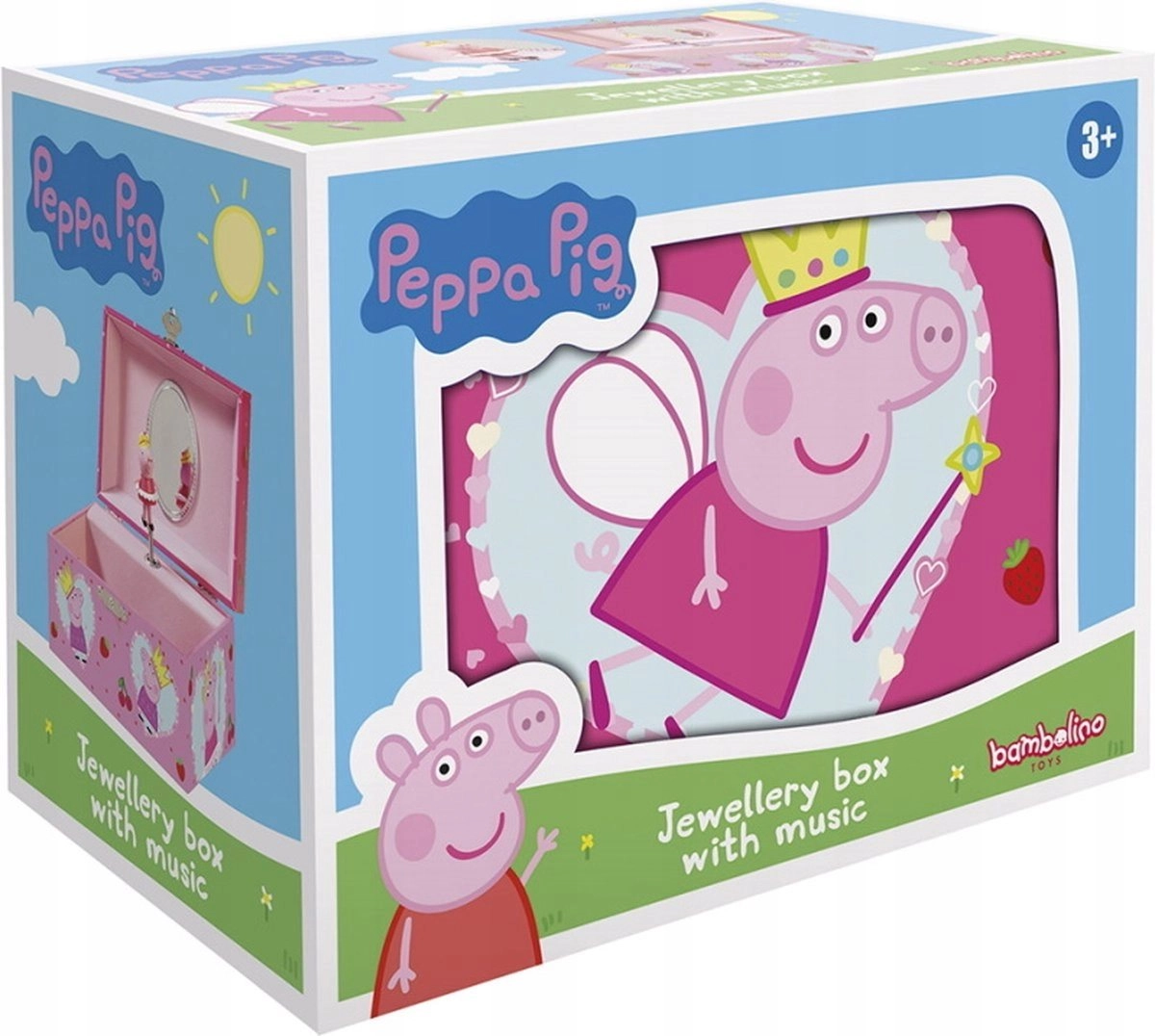 Preslatka dječja glazbena škrinjica za nakit s motivom Pepa Praščić za sigurno spremanje nakita i dragocjenosti. Nakon otvaranja pokreće se nježna melodija, a figurica se okreće. Natahuje se metalnom ručicom na stražnjoj strani, pa ne zahtijeva baterije.