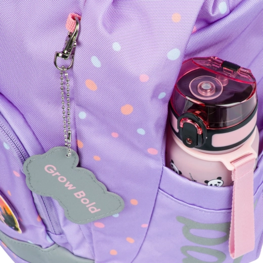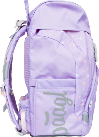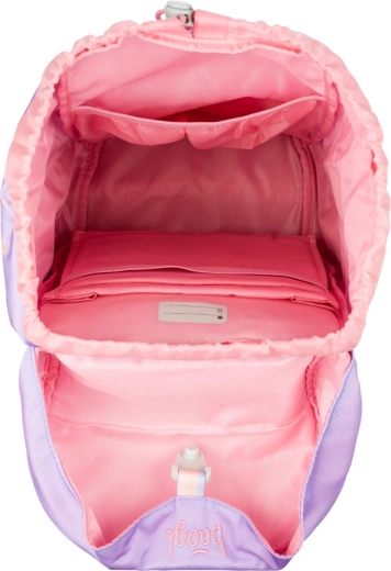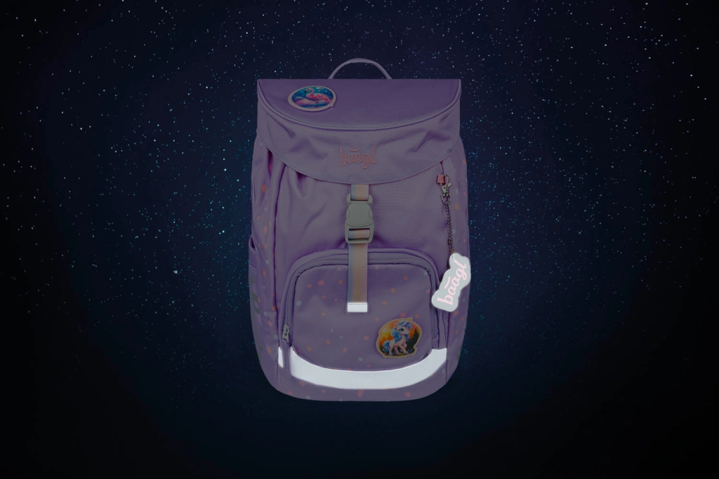 Jednokomorno unutarnje raspoređivanje s džepom i gumicom za mape olakšava preglednu organizaciju školskog pribora. Ruksak je od recikliranog, vodootpornog materijala, a izgled se može mijenjati zahvaljujući odvojivim bedževima. Dio seta je jednoslojna pernica s dvjema preklopnim klapnama i kvalitetnim YKK patentnim zatvaračem (bez ispune), vrećica s džepom na patent od čvrstog perivog materijala, dječja pregača s dvama donjim džepovima te praktični novčanik za nošenje oko vrata.