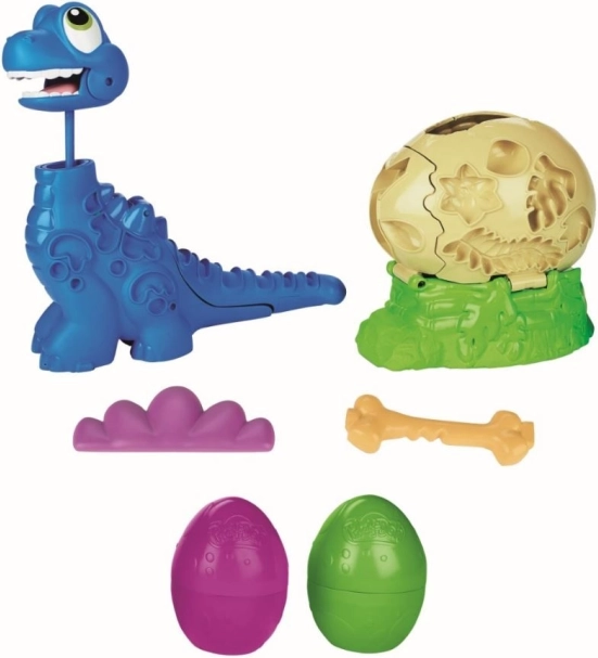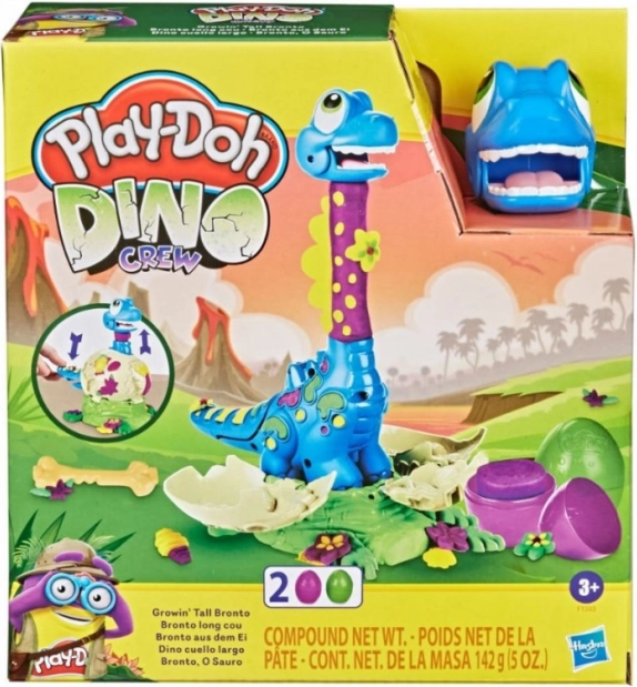 Pomozite malom Brontu izaći iz jajeta i gledajte kako mu raste vrat! Dovoljno je napuniti figuricu PLAY-DOH-a i pritisnuti rep – vrat će se izvući i zabava može početi. Uz kalupe na figurici i jajetu izradit ćete lišće, cvijeće, kosti i stylish leptir-mašnu.