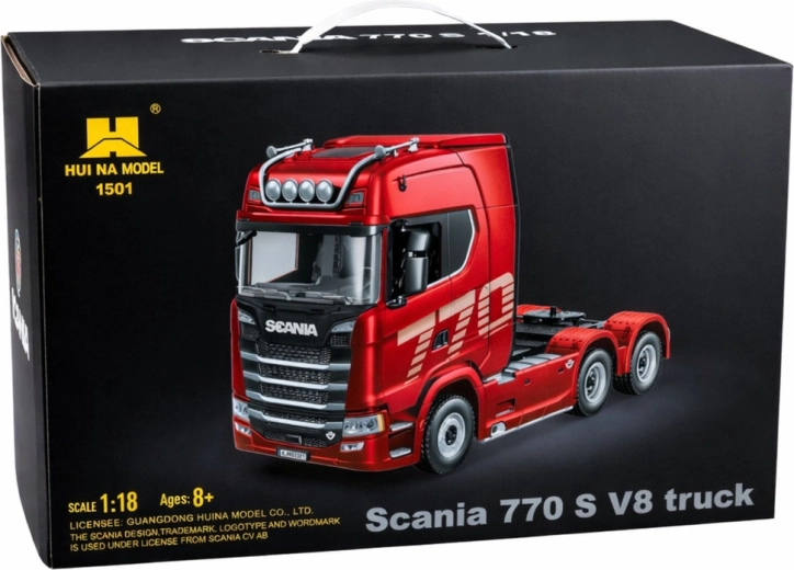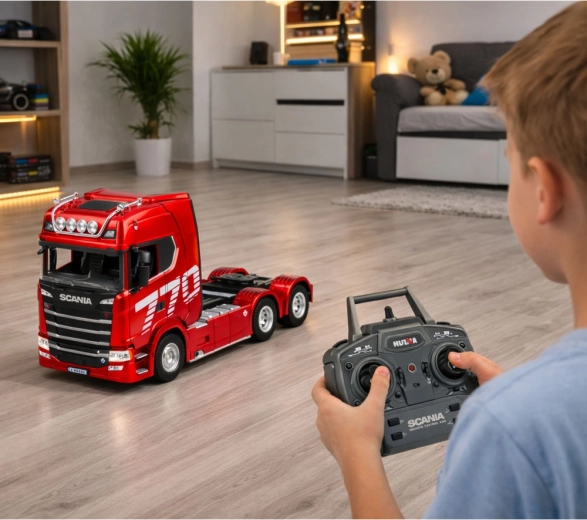 Realistični model tegljača SCANIA na daljinsko upravljanje marke Huina u mjerilu 1:18 nudi detaljnu izradu, svjetlosne i zvučne efekte te izdržljivu konstrukciju od kvalitetne plastike. S dometom upravljanja do 25 m, akumulatorom 7,4 V 1200 mAh i vožnjom oko 15 minuta idealan je za zabavu u kući i na otvorenom.