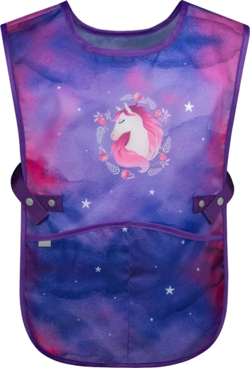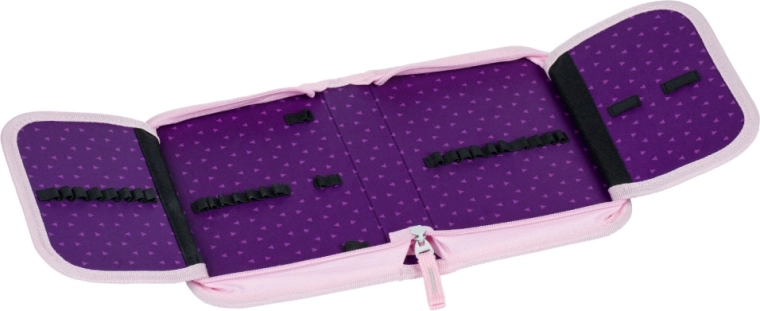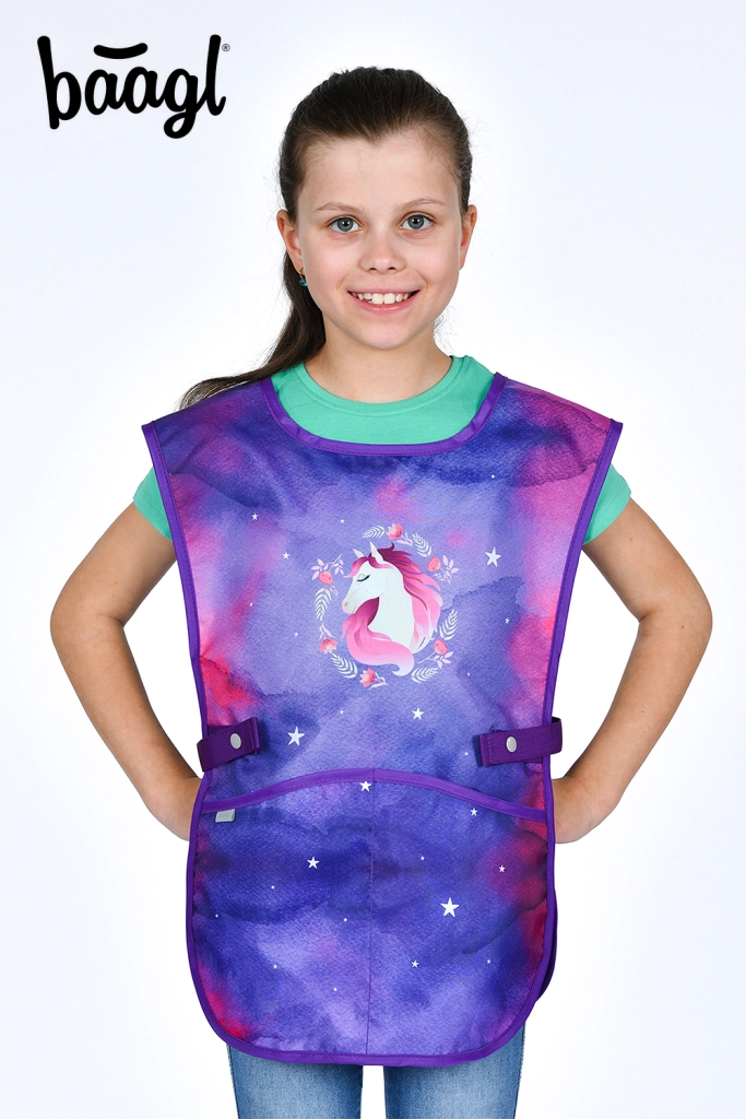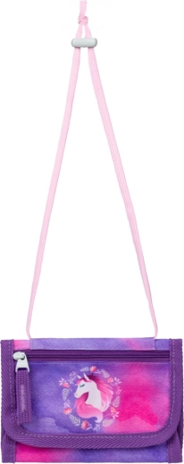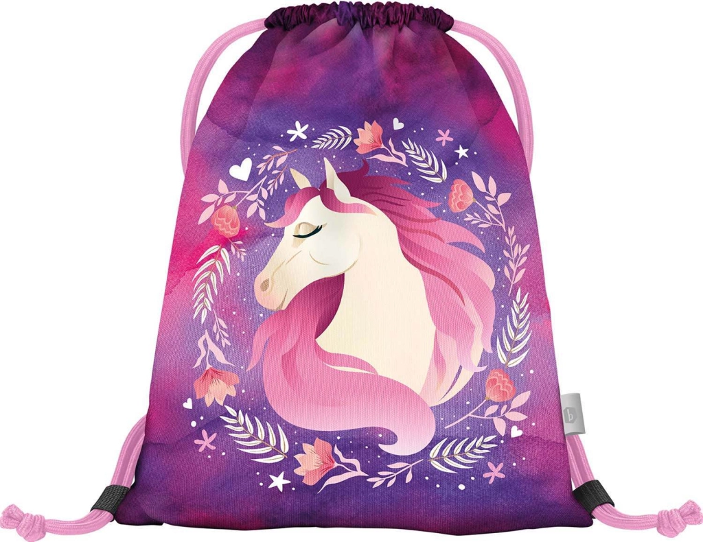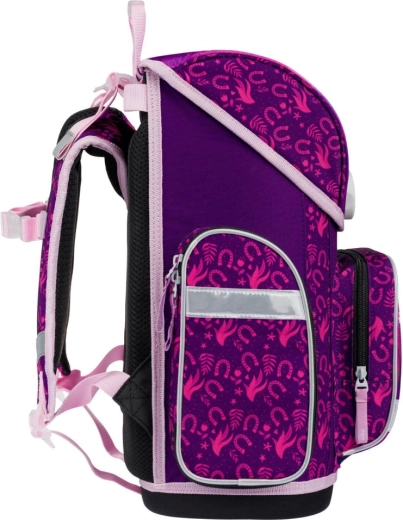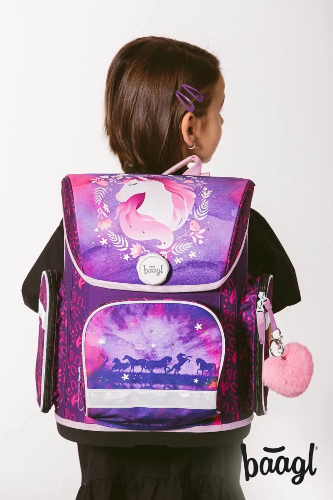 Kompletna školska oprema za male školarce s motivom konja u čarobnim ljubičasto-ružičastim bojama. Set sadrži ergonomsku aktovku s podesivim leđnim sustavom, laganu vrećicu za obuću, pernicu s dvije preklopne stranice, perivu pregaču i novčanik za vrat. Sigurnost osiguravaju reflektirajući elementi, udobnost prozračna leđa i jednostavno rukovanje magnetskim zatvaranjem Fidlock.
