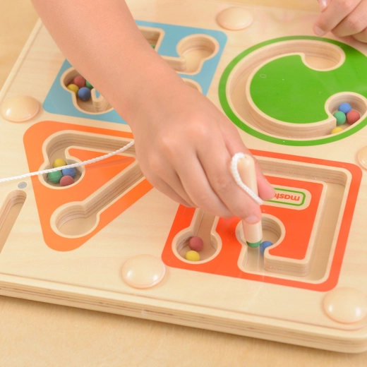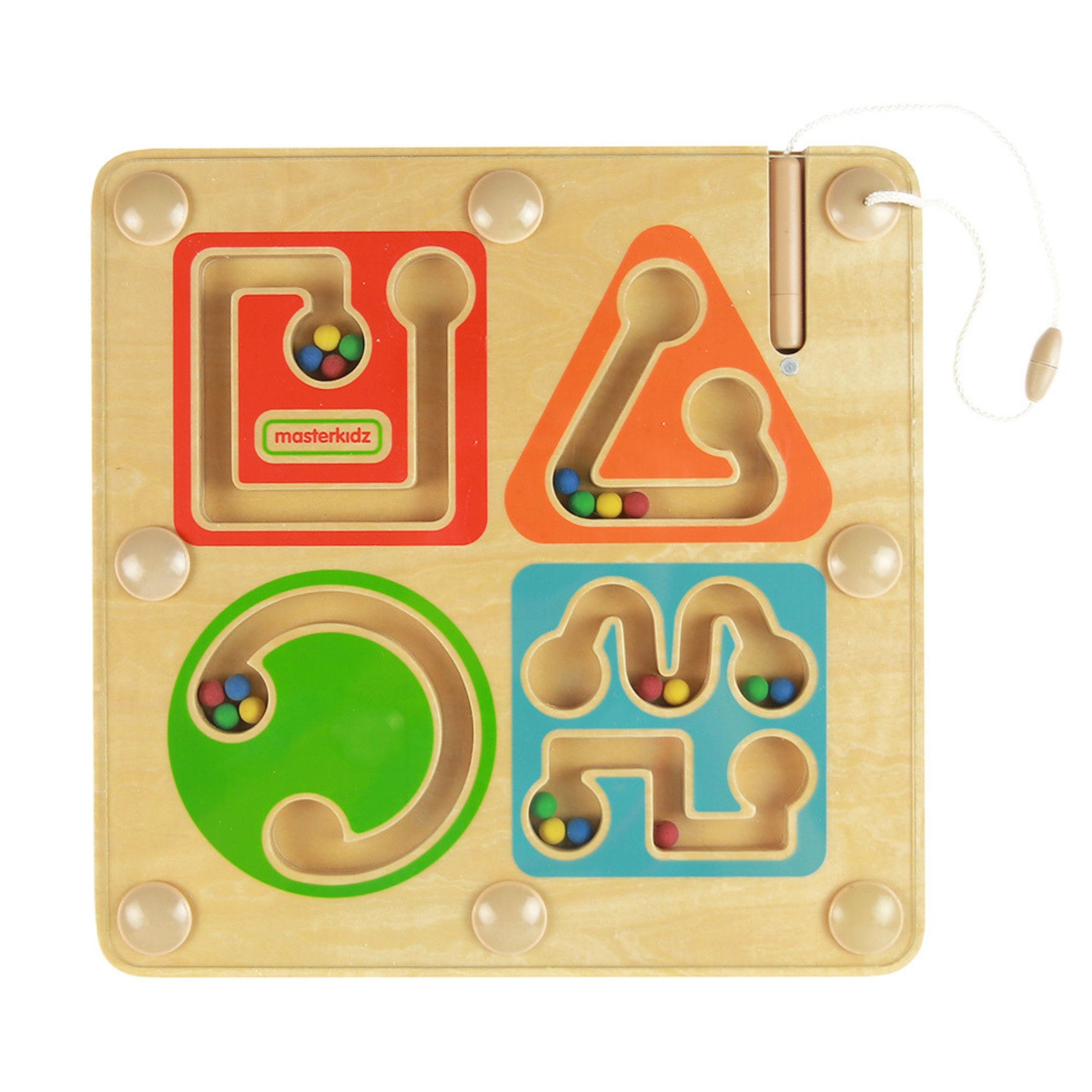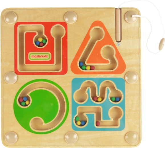 Drveni magnetni labirint marke MASTErKIDZ pretvara prve korake u pisanju u zabavu. Pomoću magnetske olovke na vezici dijete vodi šarene kuglice četirima zavijenim stazama, čime vježba finu motoriku, koordinaciju oko–ruka i koncentraciju. Zahvaljujući zatvorenom sustavu kuglice ostaju sigurno unutra, a igračka je idealna za dom i putovanja.