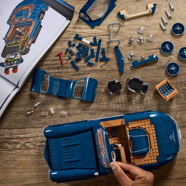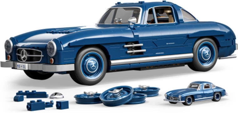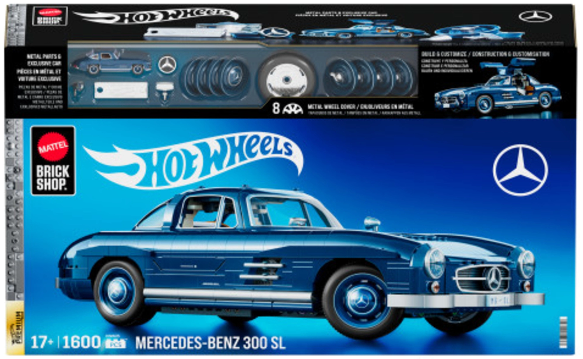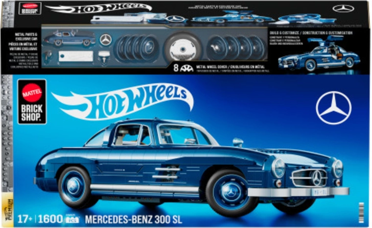 Sastavite kultni automobil Mercedes‑Benz 300 SL u omjeru 1:12 od 1600 dijelova iz serije HOT WHEELS Brick Shop. Model oduševljava plavom karoserijom, brojnim pokretnim elementima (otvoriva vrata, poklopac motora, prtljažnik, upravljanje kotačima) i metalnim dijelovima za prilagodbu izgleda (naplatci, retrovizori, logo). U pakiranju se nalazi i kolekcionarski mini model 1:64 te elegantno pakiranje idealno kao poklon.