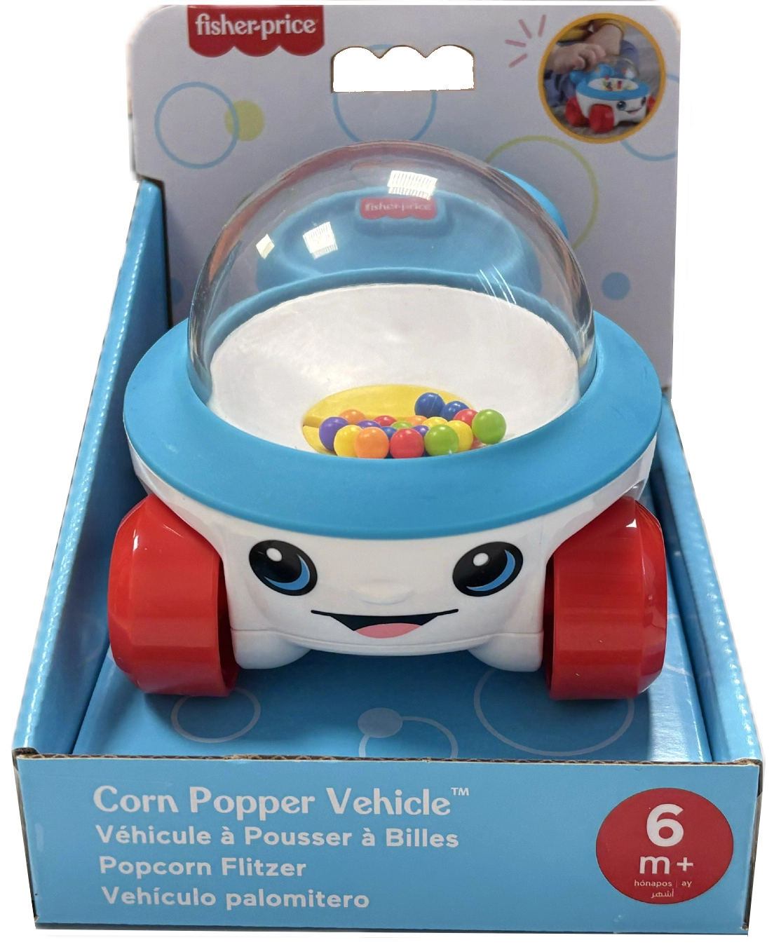 Autić s nasmijanim licem i prozirnom kupolom punom šarenih kuglica oduševit će svaku bebu. Kada se dijete zaigra, autić gura naprijed, kuglice unutra skaču i zveckaju, što prirodno motivira na puzanje i kretanje. Kompaktan oblik i čvrsti kotači osiguravaju glatku vožnju po tepihu i podu.
