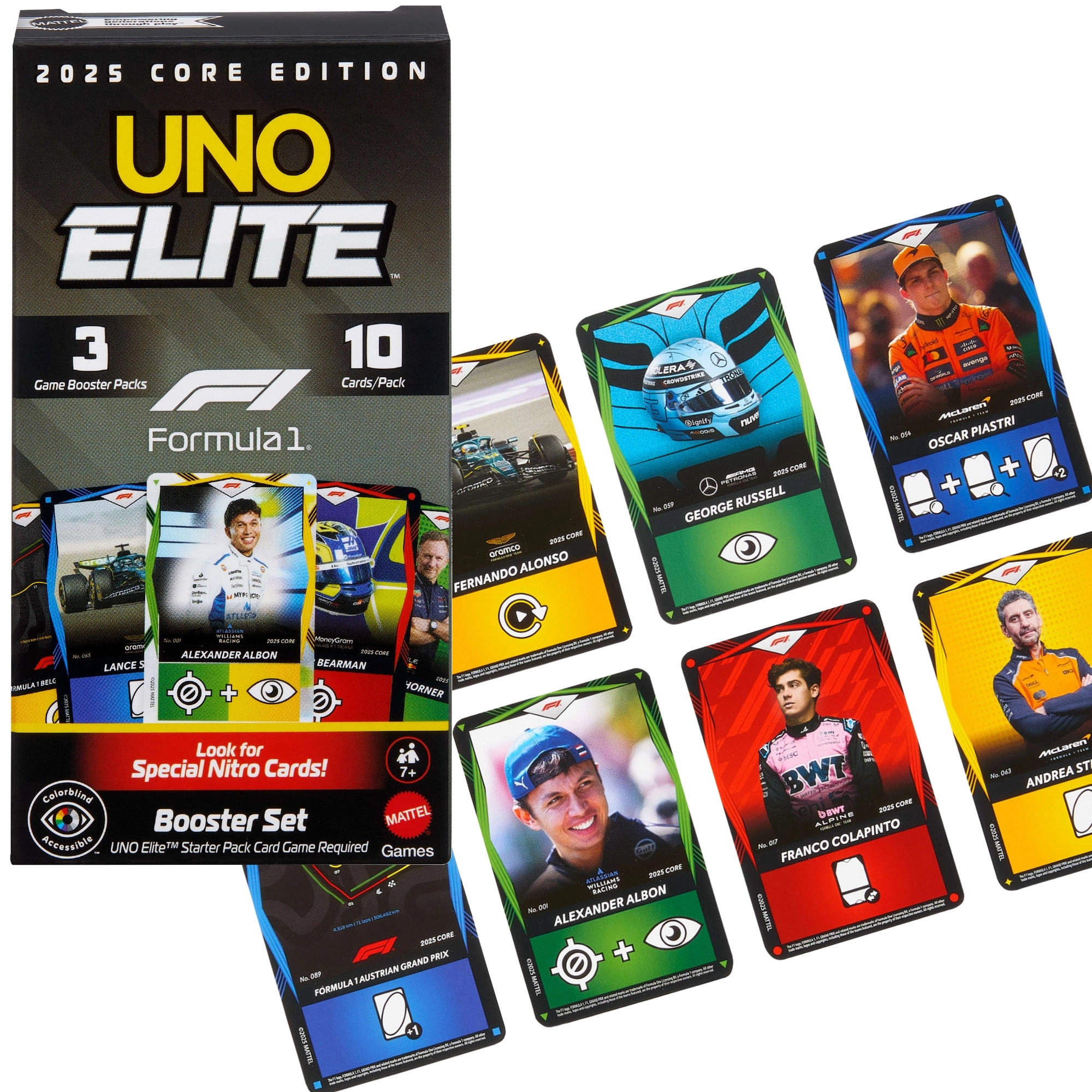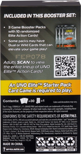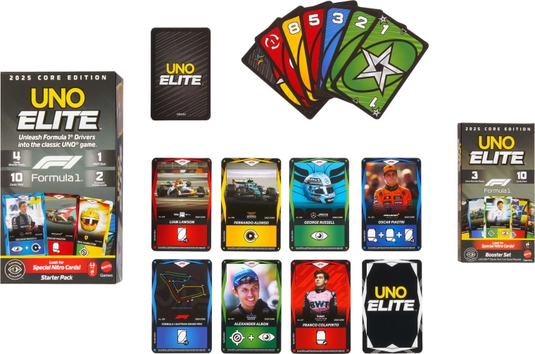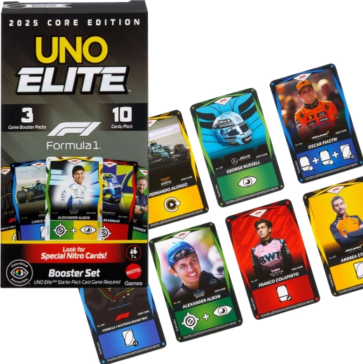 Uđite u visok ritam utrka s proširenjem UNO Elite Formula 1 2025. Svaki Booster Pack donosi nasumično odabrane karte s motivima F1 vozača, bolida, kaciga i staza. Posebne Elite karte aktiviraju svoje sposobnosti pri odigravanju karte s Elite ikonom iste boje, čime dobivate nove strategije i napete trenutke u svakoj partiji.