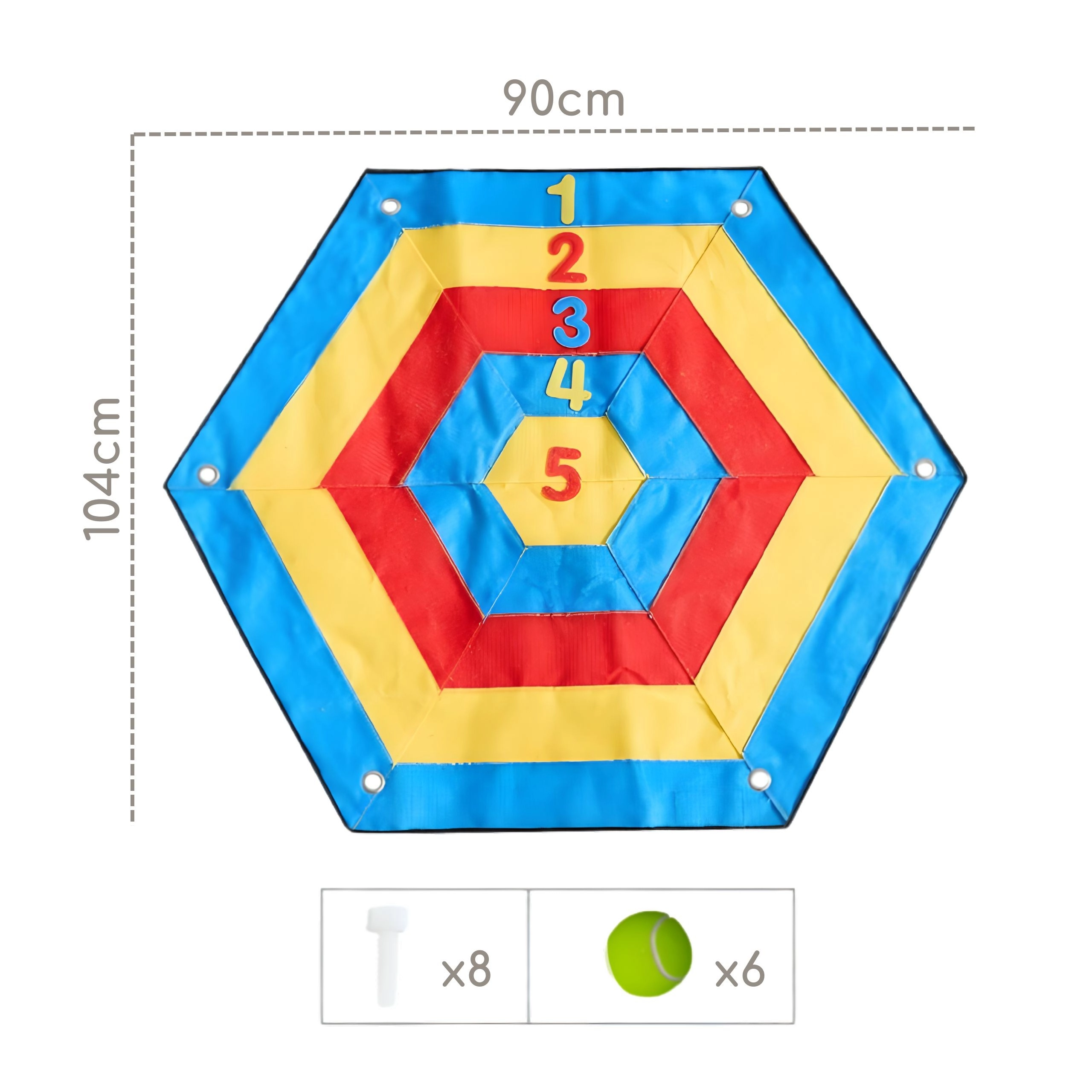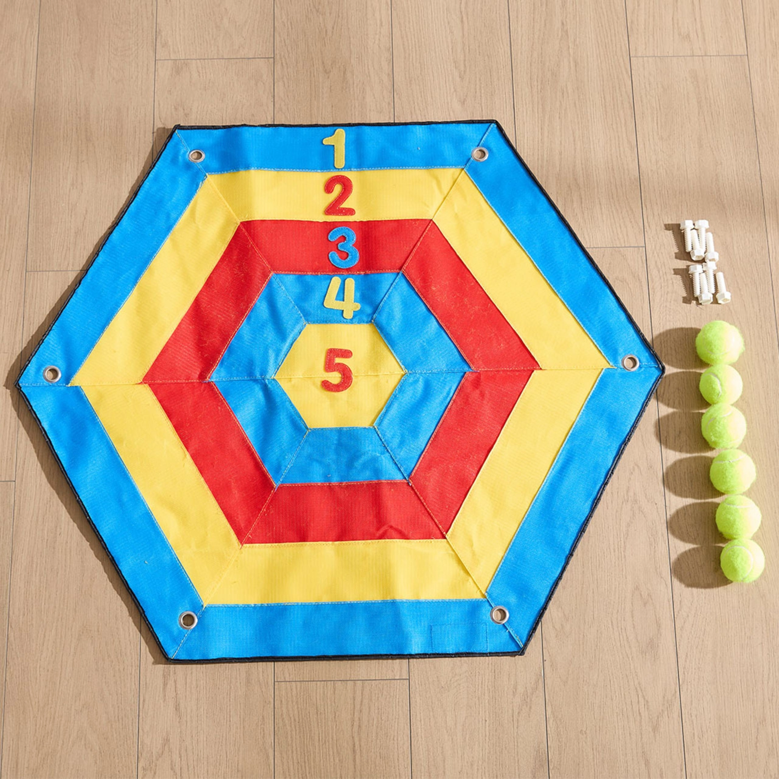 Pretvorite računanje u akcijsku pustolovinu. Velika šesterokutna podloga za metu s ušicama za vješanje osmišljena je za sigurnu i privlačnu igru: djeca bacaju meke loptice na čičak na numerirana polja i skupljaju bodove. Lagana konstrukcija omogućuje brzo vješanje na zid ili ploču te upotrebu na otvorenom.