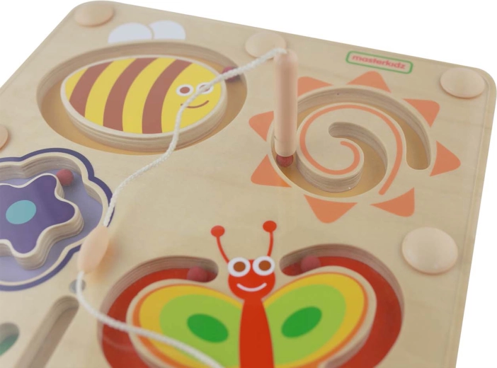 Drvena aktivna ploča s magnetskim labirintom osmišljena je za zabavno vježbanje preciznosti pokreta i koncentracije. Djeca pomoću priloženog magnetskog “čarobnog” stylusa pomiču kuglice izrezbarenim putićima i promatraju šarene ilustracije kukaca, cvijeća i sunca. Time prirodno vježbaju finu motoriku, koordinaciju oko-ruka i logičko razmišljanje.