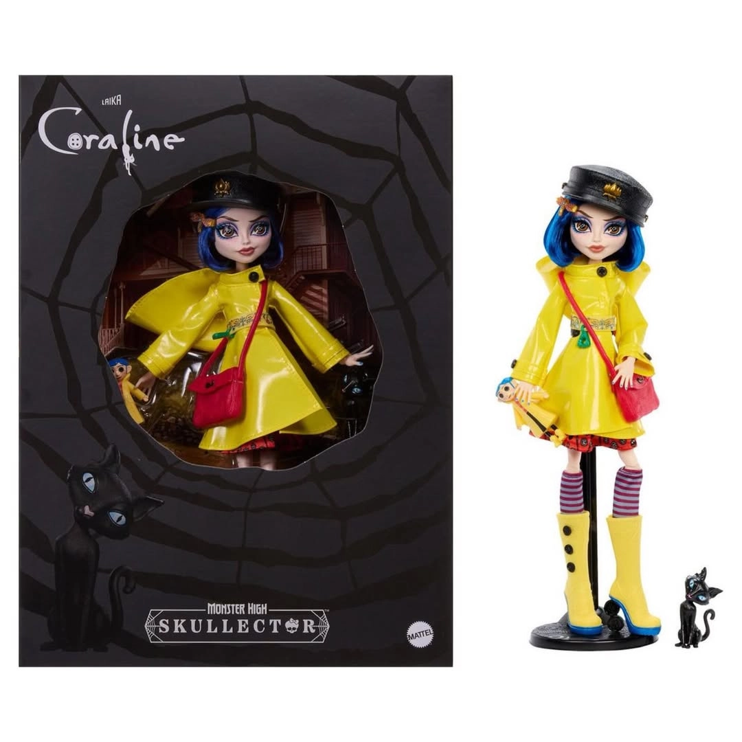 Otkrijte čaroliju mračne fantazije s lutkom CORALINE u jedinstvenoj interpretaciji Monster High Skullector. Precizno izrađen žuti kabanac s gumbima, prugaste čarape i žute visoke čizme s paukovim detaljima vjerno upućuju na filmski predložak. U kompletu su i mini lutkica Coraline s gumbastim očima, stilska torbica, šešir i figurica crnog mačka.