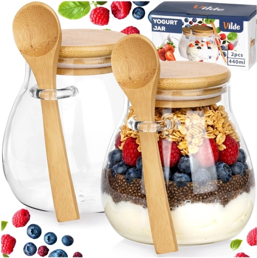 Dvije staklene čaše od 440 ml s bambuskim poklopcima i žličicama – idealne za posluživanje i čuvanje deserata i međuobroka kod kuće i na putu.