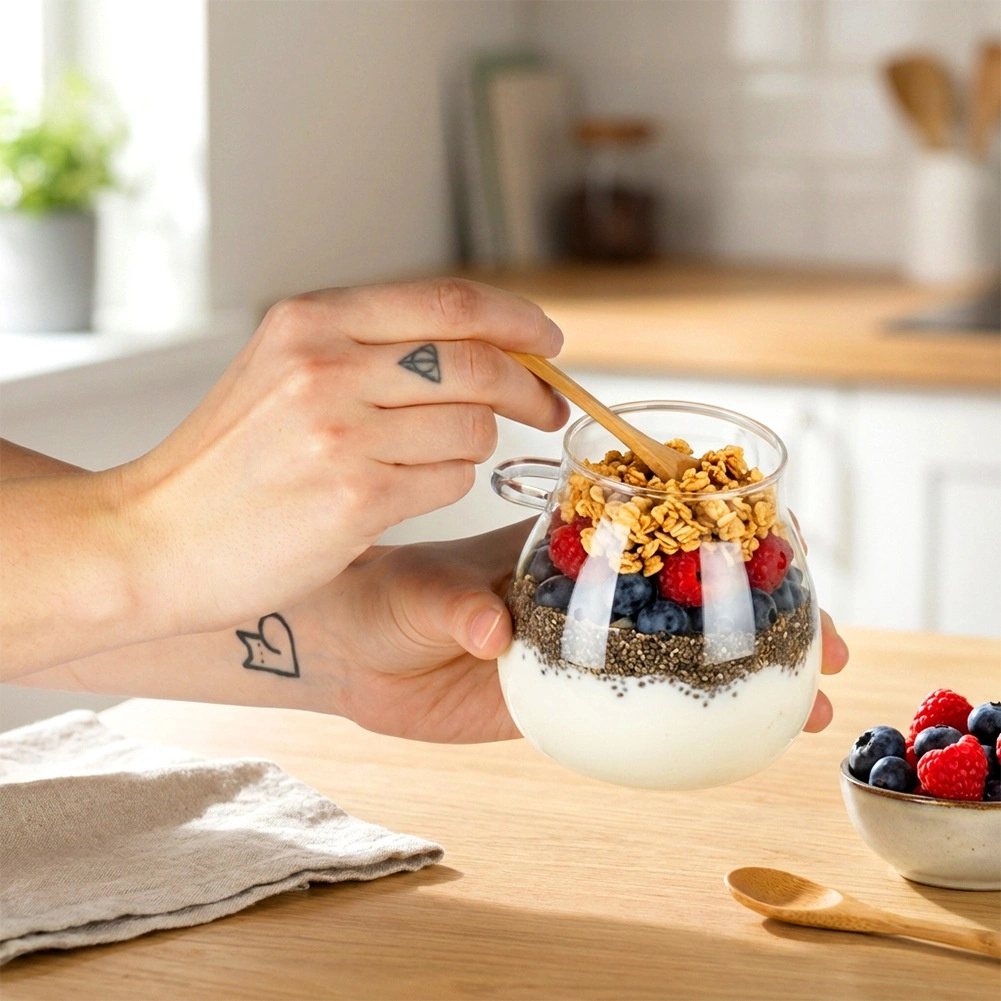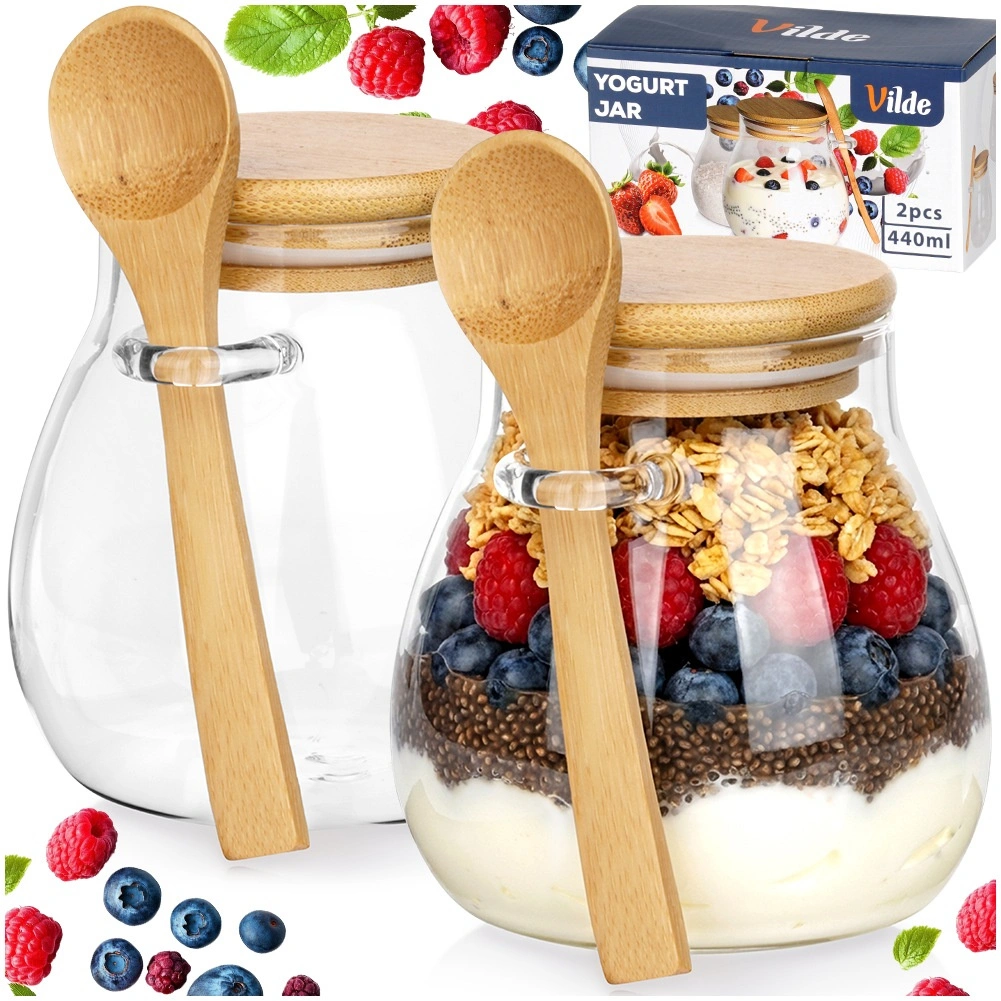 Otkrijte stilske i praktične čaše koje će istaknuti vaše domaće jogurte, chia pudinge i slojevite deserte. Prozirno staklo lijepo prezentira sadržaj, dok bambuski poklopac s brtvom štiti od isušivanja i upijanja mirisa. Integrirani držač sa strane drži žličicu uvijek spremnom za posluživanje.