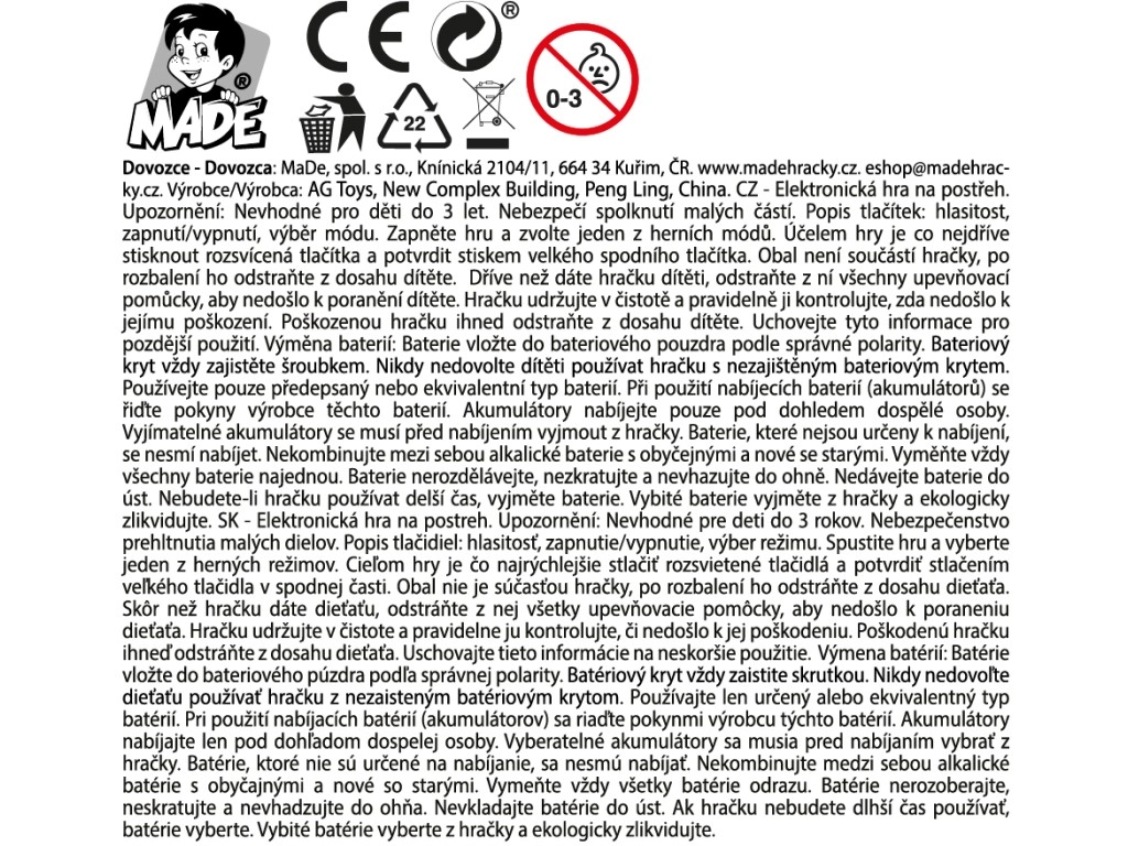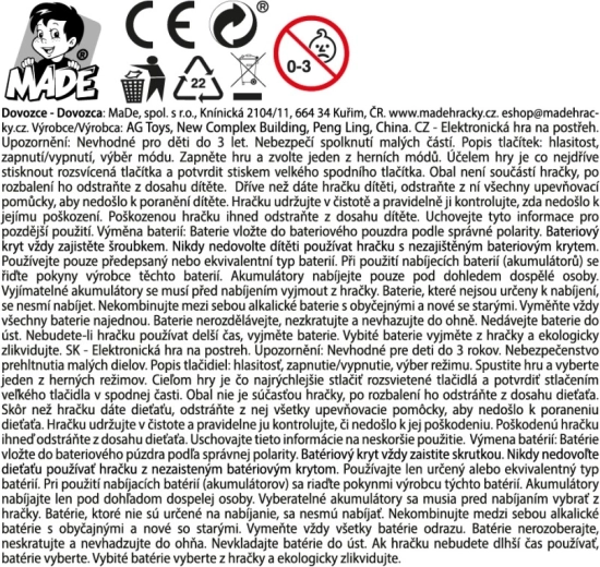 Kompaktna džepna elektronička igra donosi brzu zabavu i izazove za djecu od 6 godina. Zahvaljujući dimenzijama 13,5 × 7,5 cm lako stane u ruku i ruksak, izrađena je od izdržljive plastike i napaja se pomoću 3× AAA baterije. Sjajan izbor za putovanja, školu i dom.