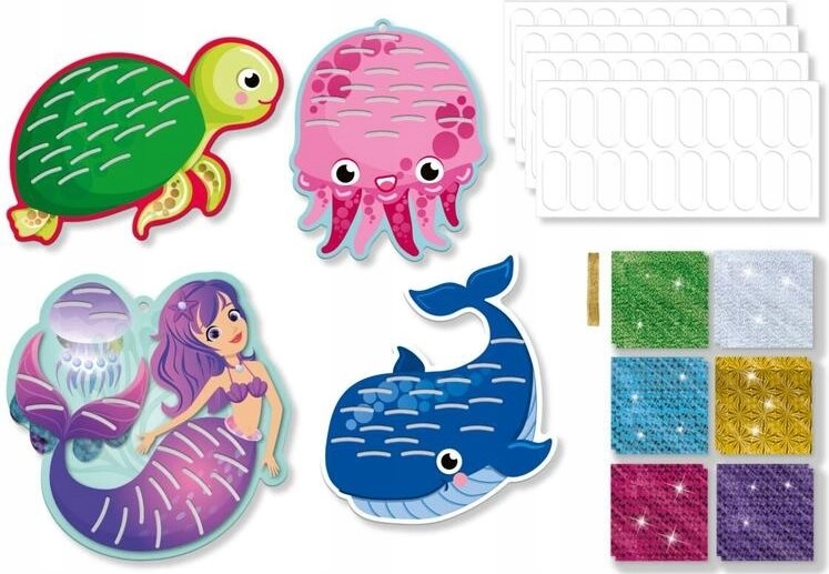 4 kartonska predloška morskih stvorenja (15 × 15 cm) – kit, hobotnica, kornjača i morska sirena; 10 listova blistave folije u 5 metaliziranih boja; samoljepljivi pjenasti elementi; upute