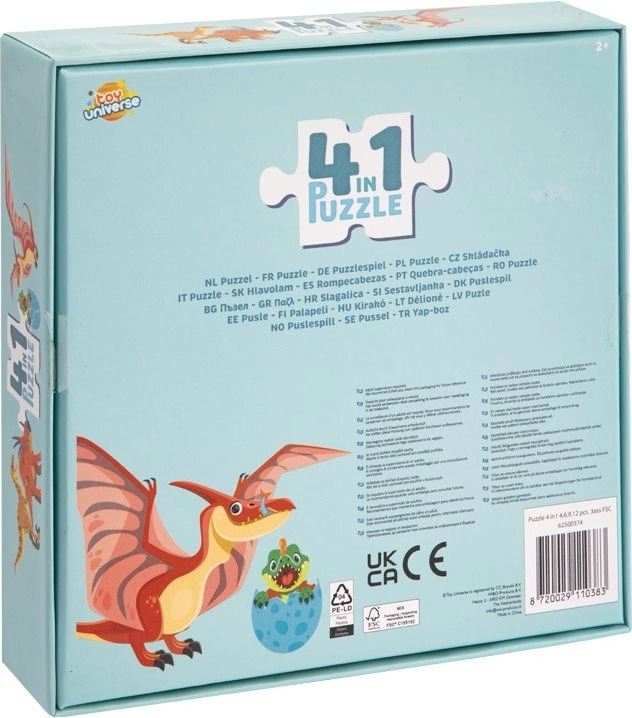 Otkrijte zabavne i edukativne progresivne puzzle 4u1 s motivom dinosaura od TOY UNIVERSE. Četiri slagalice od 4, 6, 9 i 12 dijelova s postupno rastućom težinom razvijaju finu motoriku, logičko razmišljanje i strpljenje djece. Svaka složena slagalica ima kompaktne dimenzije približno 17,4 × 17,4 cm.