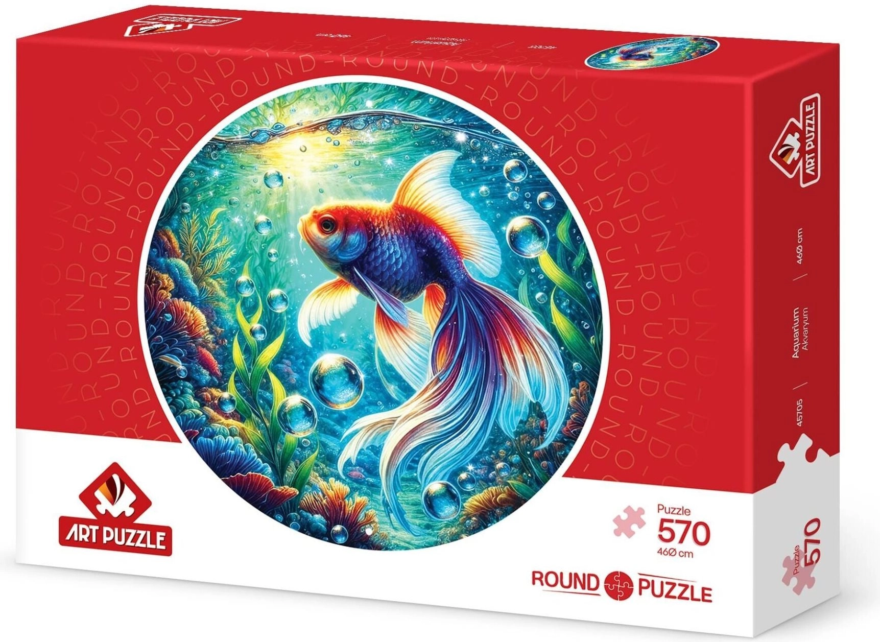 Otkrijte zabavu s okruglim puzzlama Akvarij od 570 dijelova. Zahvaljujući originalnom kružnom obliku i motivu podvodnog svijeta, nude izazov za djecu i odrasle, a nakon slaganja stvaraju dekorativnu sliku promjera 46 cm.