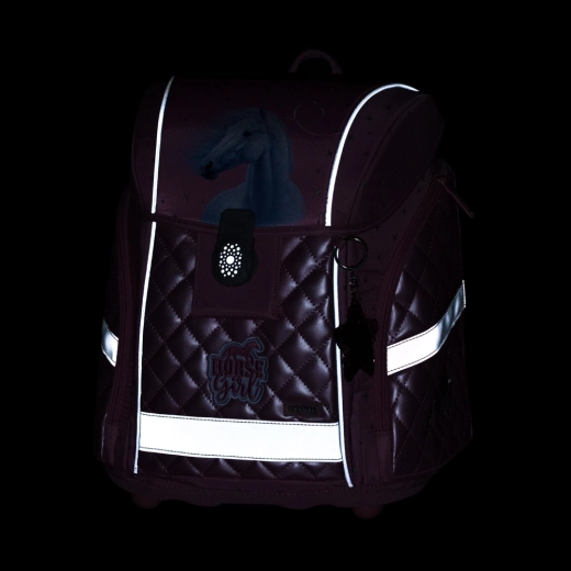 Lagana i ergonomska školska torba Premium Light s motivom Horse Girl idealna je za niže razrede osnovne škole. Teži samo 970 g, nudi volumen 26 l, čvrstu konstrukciju, prozračno podstavljeni dio za leđa, široke mekano podstavljene naramenice te prsni i zatezne remene za savršeno udobno nošenje. Ne nedostaju reflektirajući elementi, magnetno zatvaranje, unutarnji organizer/razdjelnik i mnogo džepova za pregledno spremanje školskog pribora.