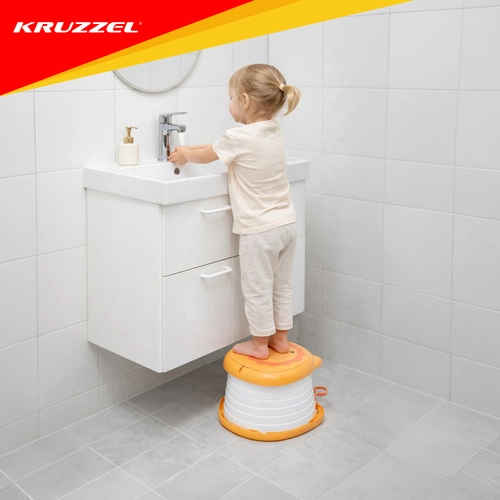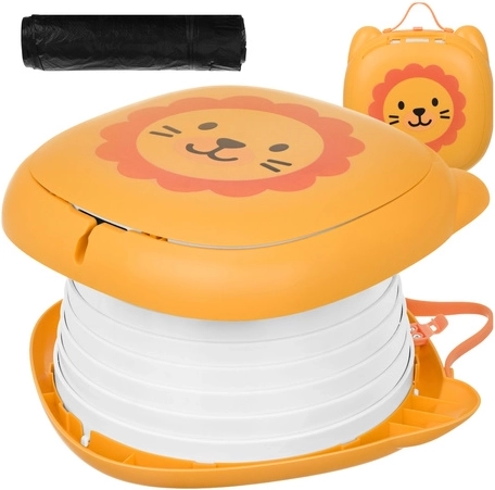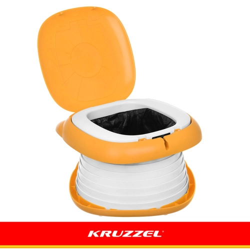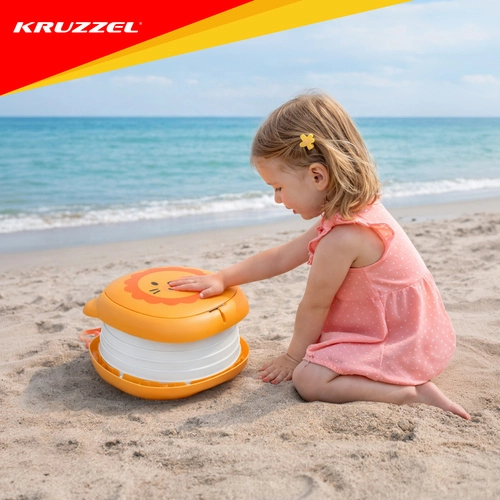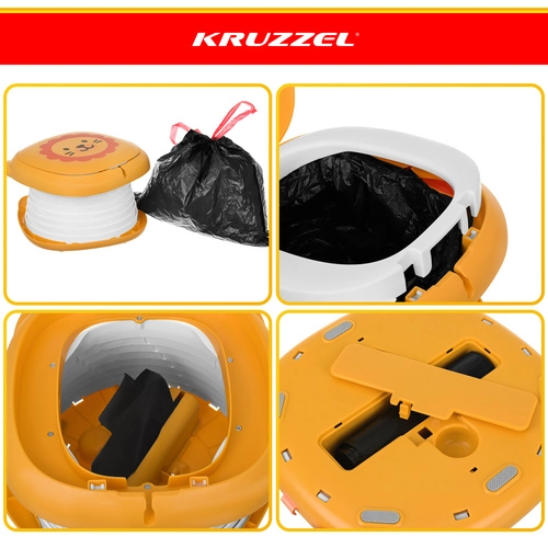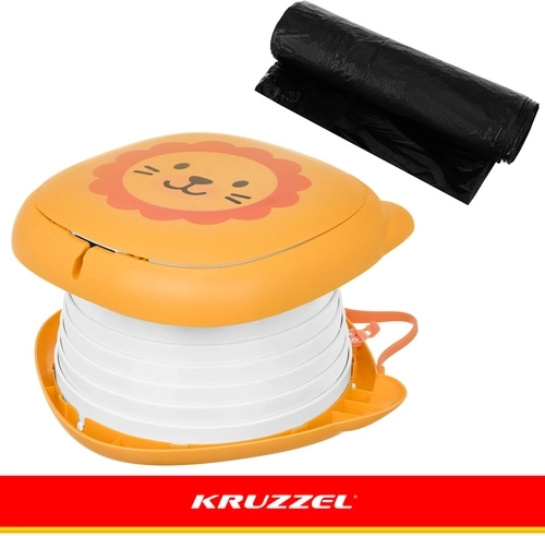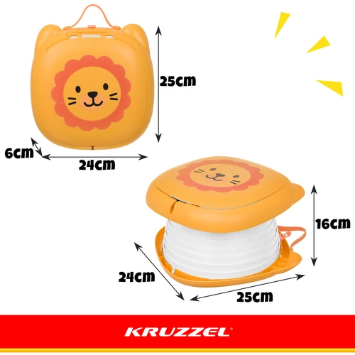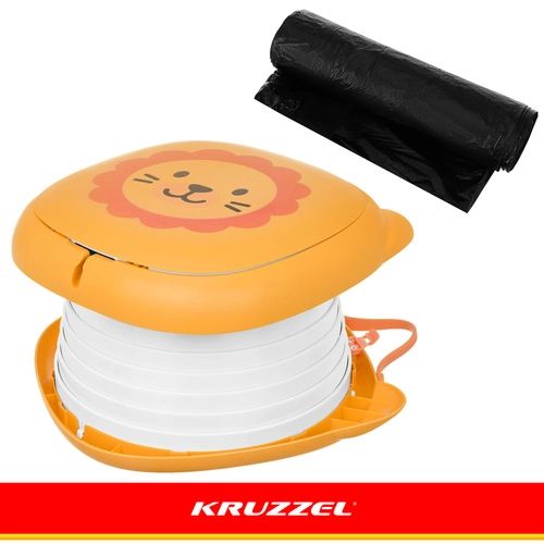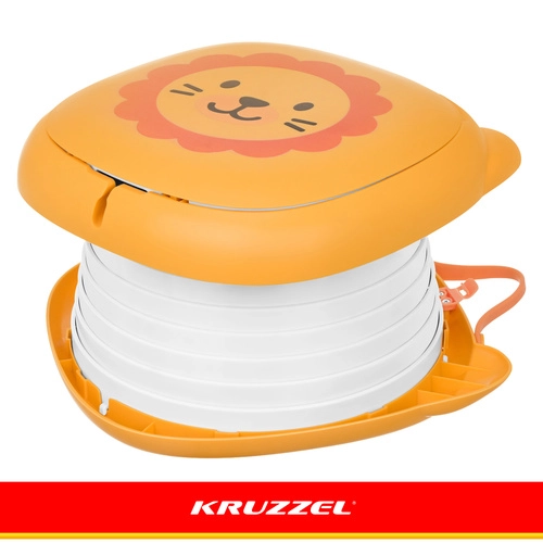 Sklopiva kahlica KRUZZEL – Lav dizajnirana je za udobnost djece i mir roditelja na putovanjima. Simpatičan motiv lava potiče dijete na uporabu izvan doma, dok čvrsta konstrukcija od ABS-a i silikonski mijeh osiguravaju udobnost, stabilnost i lako čišćenje. Integrirani pretinac za rolicu vrećica znači da vam je sve potrebno uvijek pri ruci.