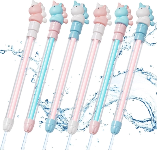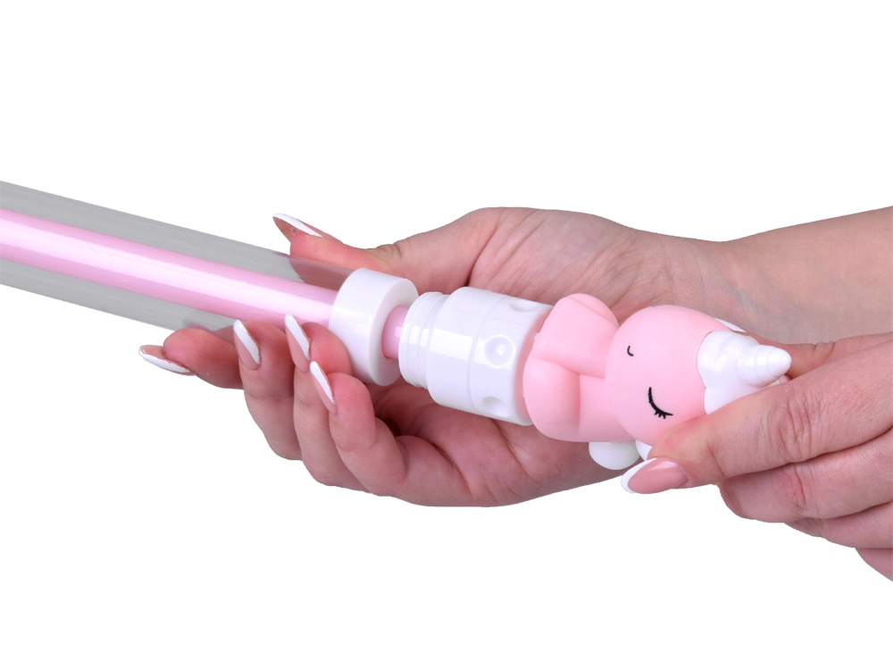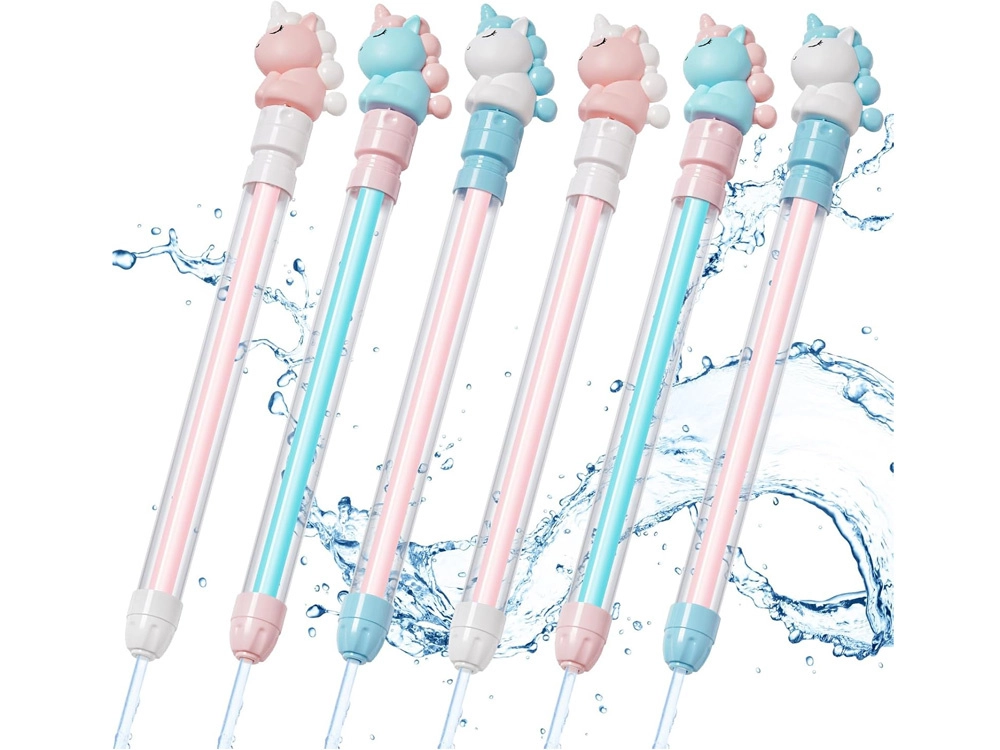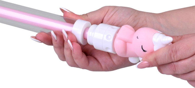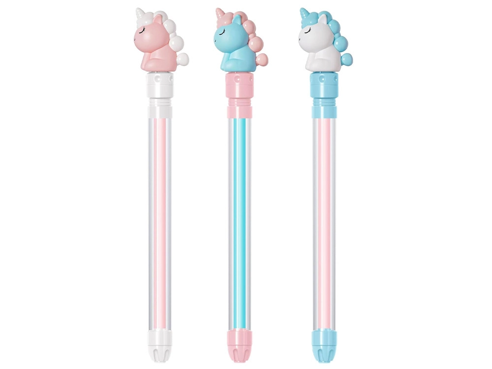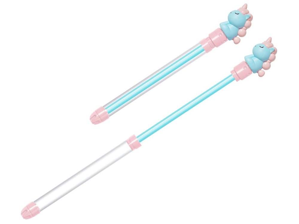 Vodeni pištolj s jednorogom idealna je igračka za vruće dane. Prozirno tijelo pokazuje razinu vode, a pumpni mehanizam radi kao klasična štrcaljka – dovoljno je uroniti vrh u vodu, povući za ručku i zatim pritisnuti za snažan mlaz. Djeca tako dobivaju jednostavno i zabavno pomagalo za vodene dvoboje uz bazen, u dvorištu ili kraj jezera.