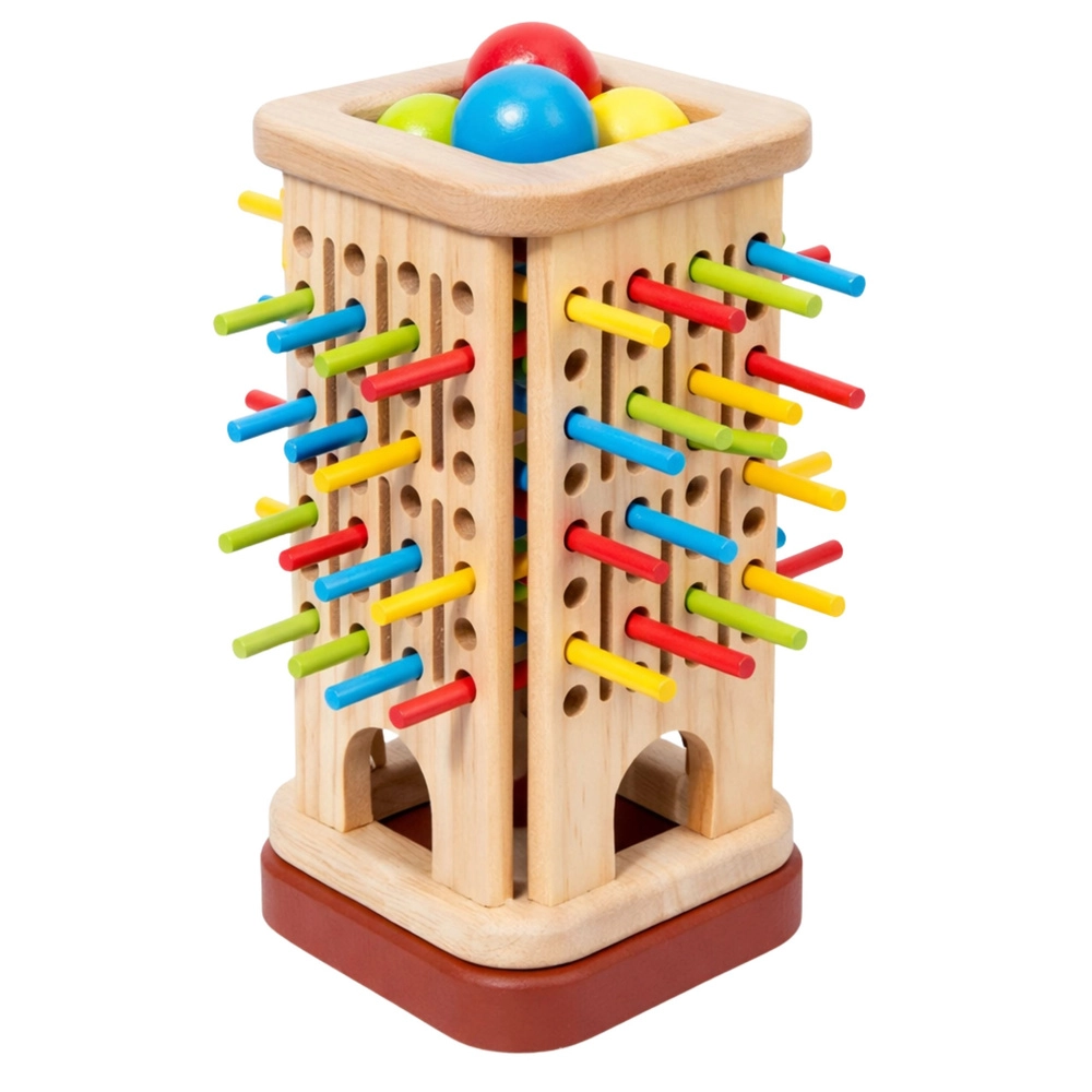 Drvena vještinska igra u obliku tornja idealna je za djecu i odrasle. Cilj je pažljivo izvlačiti štapiće tako da kuglice ne ispadnu iz unutrašnjosti tornja. Svaki potez provjerava finu motoriku, preciznost i strateško razmišljanje. Zahvaljujući kvalitetnom prirodnom drvu, igra je izdržljiva i sigurna, a žive boje dodatno potiču prepoznavanje boja i koncentraciju.