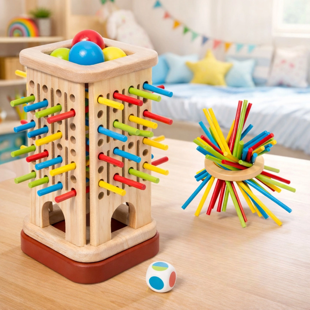 Otkrijte zabavnu obiteljsku igru koja spaja vještinu, logičko razmišljanje i šarenu zabavu. Drveni toranj sa štapićima i kuglicama je siguran i izdržljiv, izvrsno razvija koordinacijske sposobnosti, strpljenje i koncentraciju. Kocka i okretni kotačić dodaju element slučajnosti i povećavaju napetost pri svakom potezu.