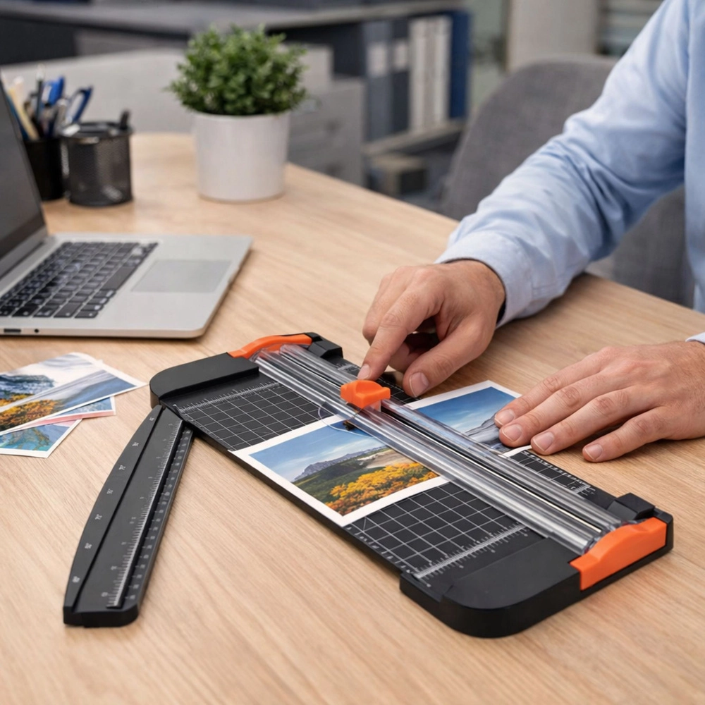 Integrirana mjerna mreža, ravnala u centimetrima i inčima te preklopna ruka za dulje listove osiguravaju precizno poravnanje i ravne rezove dokumenata i fotografija.