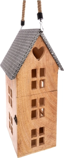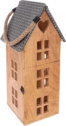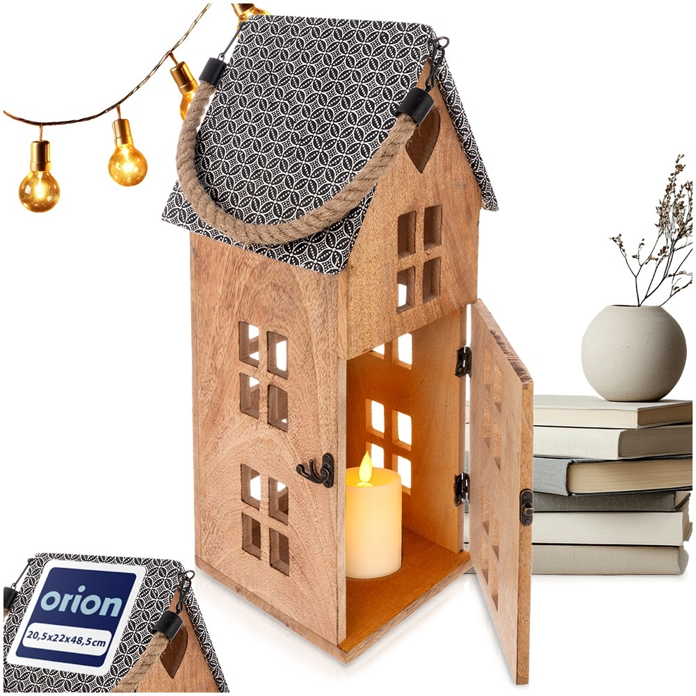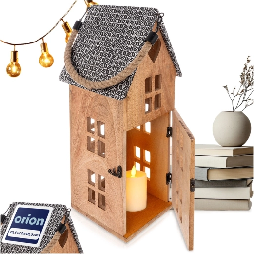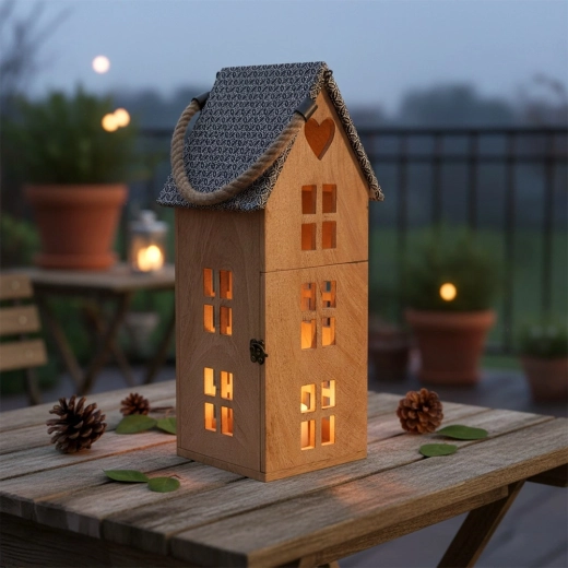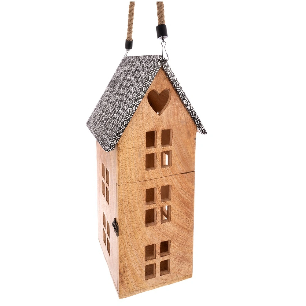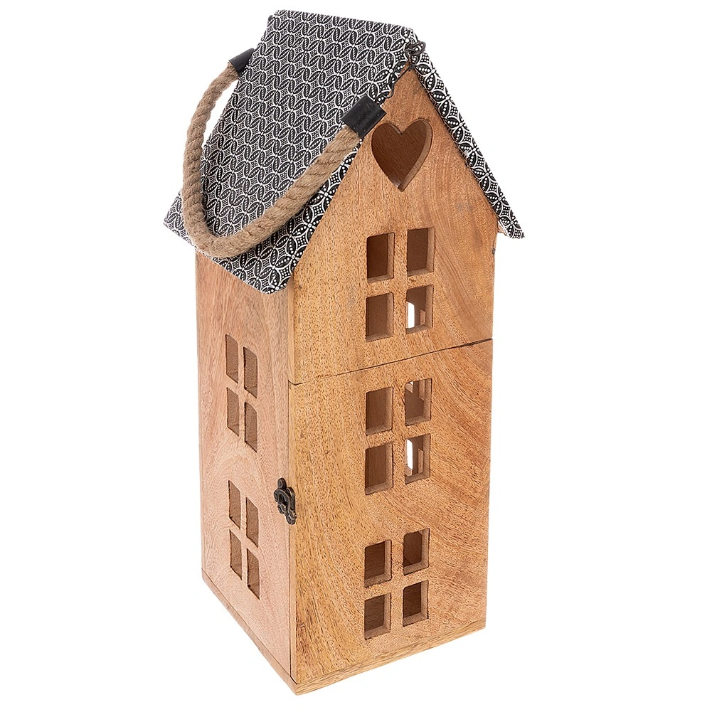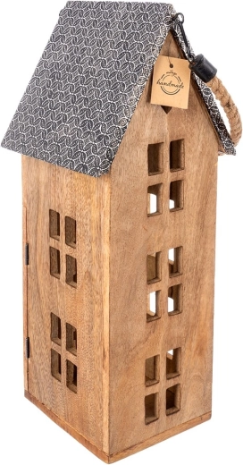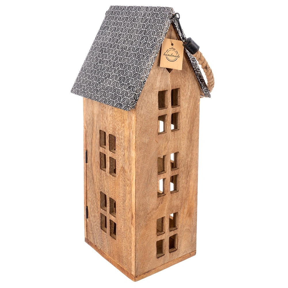 Stilski lampion u obliku kućice od mangovog drva s metalnim krovom i robusnom užetnom ručkom. Namijenjen za sigurno korištenje s LED svijećom, pogodan za vješanje i postavljanje. Nudi ugodno ambijentalno svjetlo, prirodan izgled i otpornost na vlagu. Idealan za dnevni boravak, spavaću sobu, terasu ili balkon.