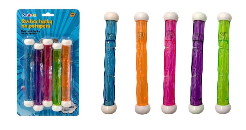 Pretvorite večernje kupanje u zabavnu pustolovinu! Sa svjetlećim štapićima SPORTO i djeca i odrasli uronit će u igru punu boja i svjetla. Štapići nakon bacanja tonu na dno, izrazito su vidljivi i u sumrak te prirodno potiču trening plivačkih vještina. Napajanje osiguravaju baterije 15× 1,5 V AG3 (uključene u pakiranju, nije ih moguće zamijeniti).