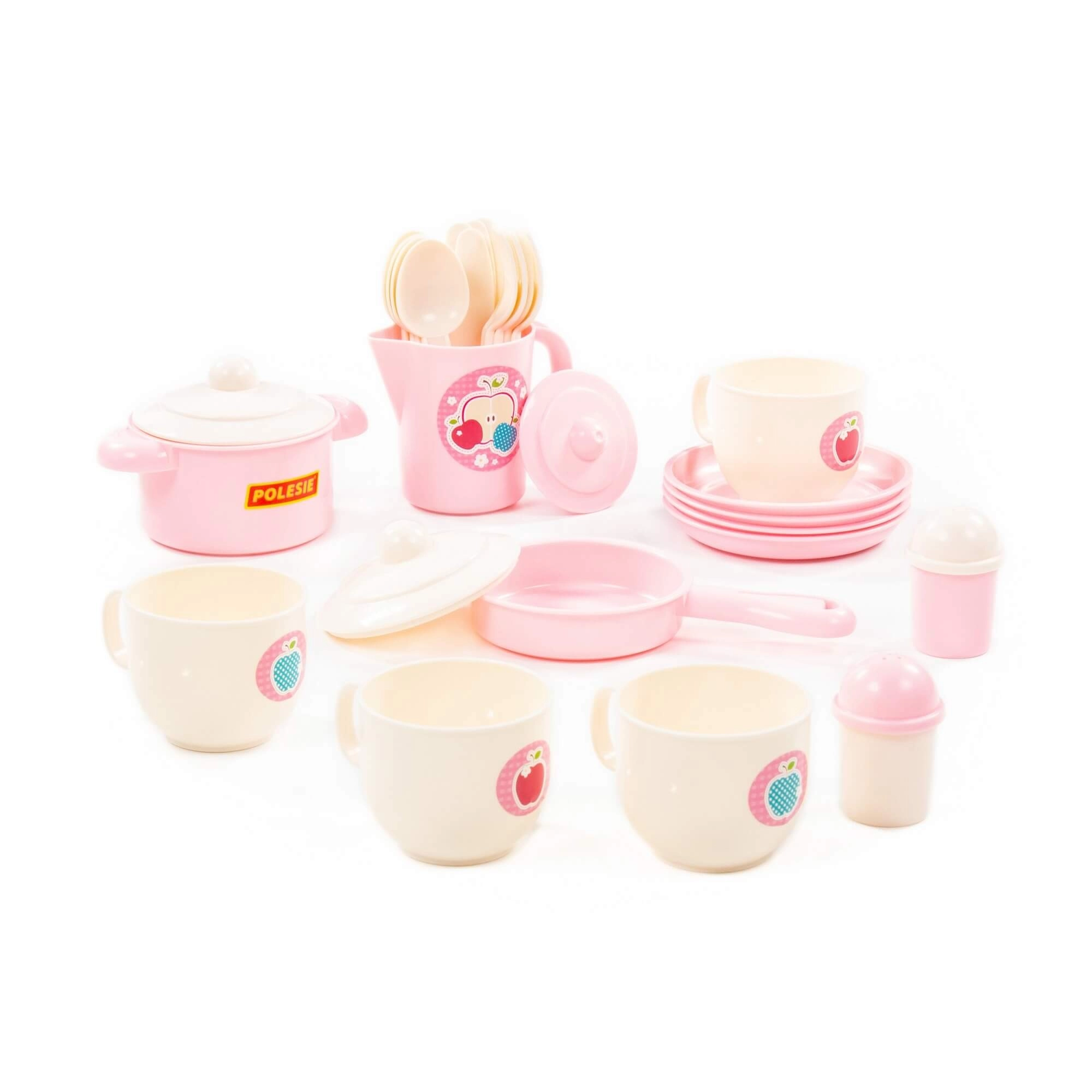 Ovaj razigrani set u nježnim pastelnim bojama donosi sve potrebno za dječje posluživanje: šalice s tanjurićima, tanjuriće, lonac s poklopcem, tavu s poklopcem, vrč, kutlaču, žlice i druge dodatke. Zahvaljujući izdržljivoj i laganoj plastici posuđem se lako rukuje i sigurno je za dječje ruke.