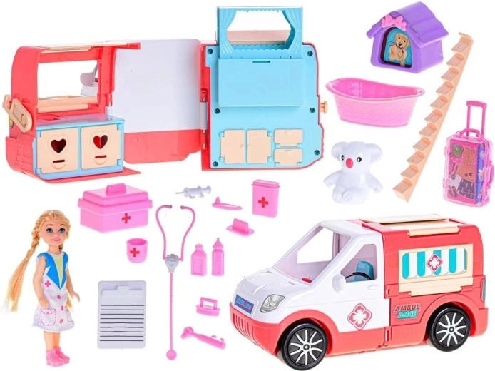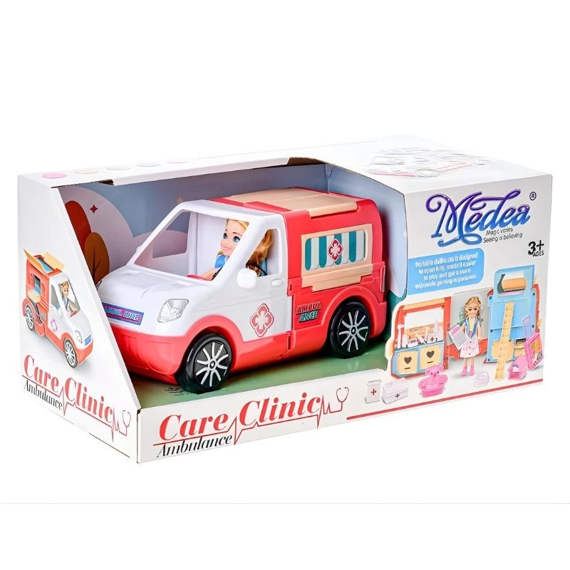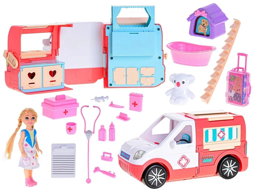 Ova pokretna klinika razveselit će sve male njegovatelje i njegovateljice. Zahvaljujući otvarajućim vratima i promišljeno uređenoj unutrašnjosti, kola hitne pomoći lako se pretvaraju u mobilnu ordinaciju za ljude i životinje. Set uključuje lutku – vozačicu hitne pomoći, medicinsku opremu, kovčežić, životinjicu s transporterom i druge dodatke za uzbudljive spasilačke misije.
