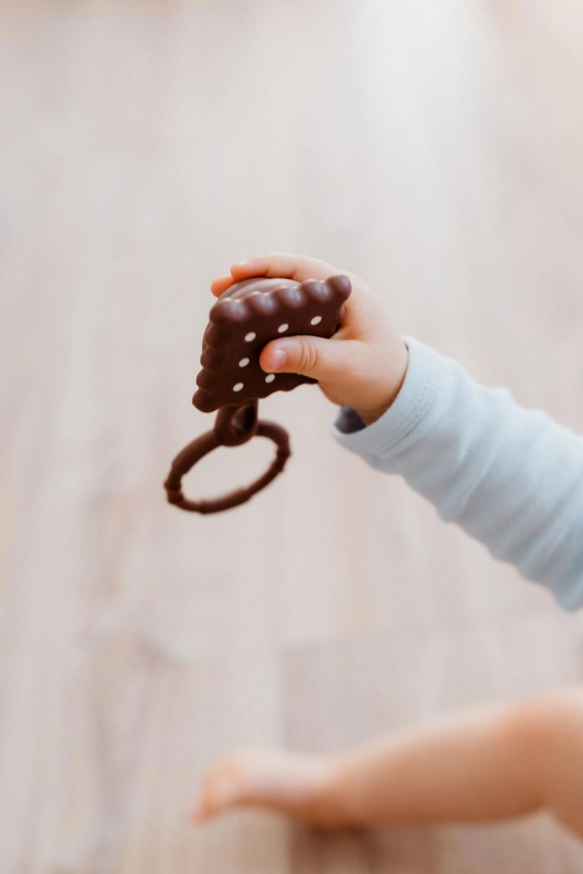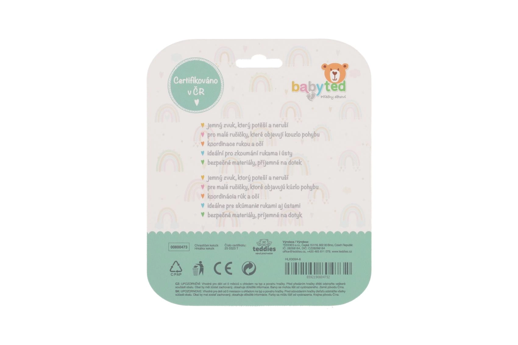 Slatko grizalo i zvečka u obliku kolačića brenda BabyTed idealna je prva igračka za bebe već od rođenja. Mekani silikon nježno masira desni tijekom nicanja prvih zubića, dok praktični prsten olakšava držanje malim ručicama. Laka konstrukcija potiče finu motoriku, a nježno zveckanje razvija slušnu percepciju. Sigurna izrada i kvalitetna obrada, certificirano u RH.